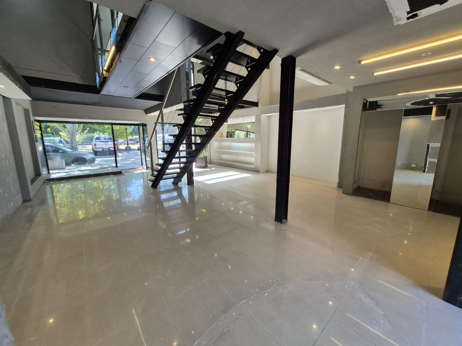 The front body features a large sales lounge on the ground floor, with an impressive glazed façade and large front windows that flood the space with natural light. At the same level is a private office with a view of the avenue, while a generously sized mezzanine balconies the main lounge. The premises are equipped with air conditioning. The central patio has an independent entrance from the street via a side hallway, ideal for suppliers or separate access.