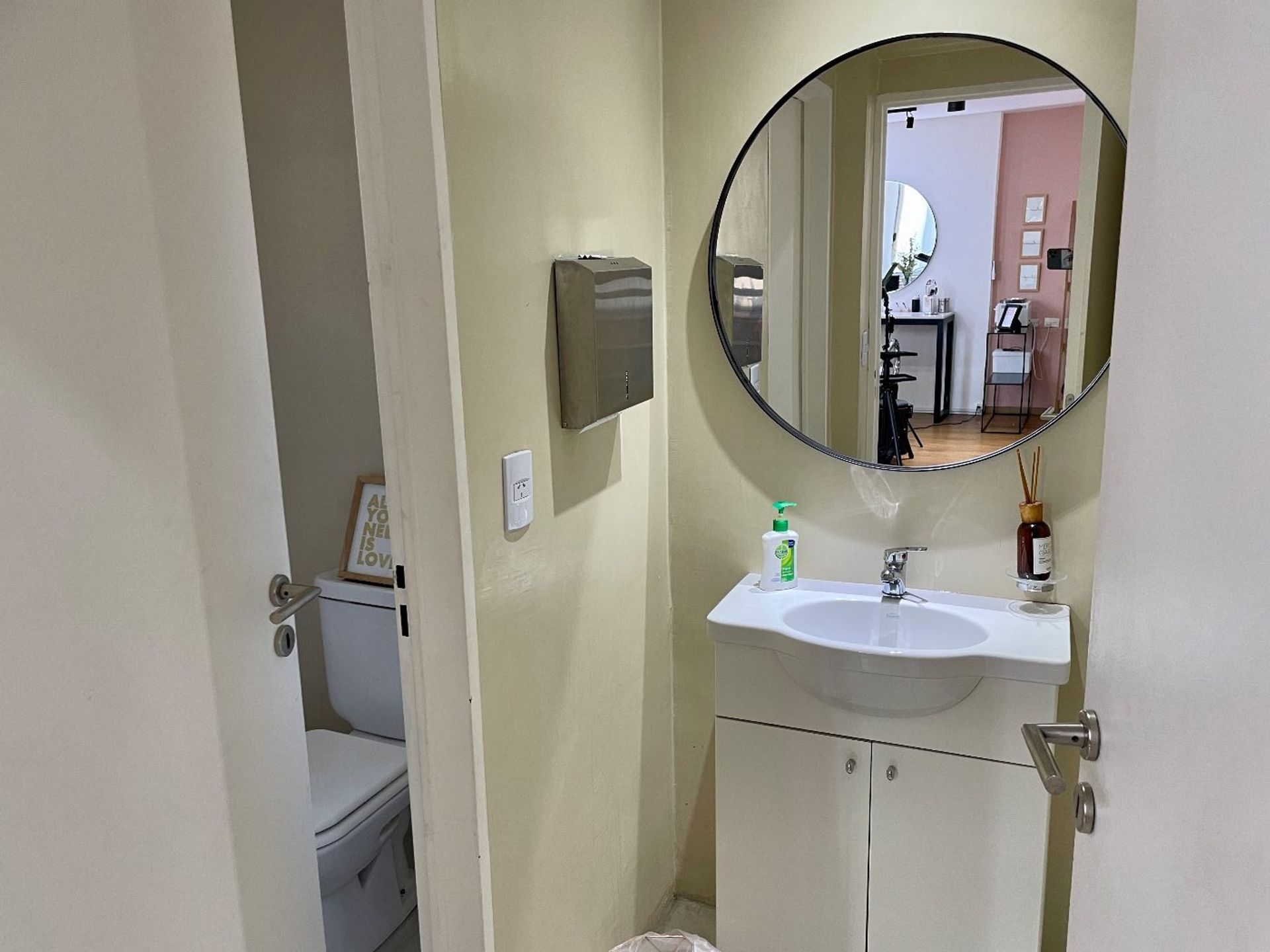 The entrance opens into a spacious private lobby. On the ground floor, 84 m² of open space include a shower bathroom. On the second floor, the same 84 m² are distributed into a front office, a storage area for merchandise and documentation, an additional toilet, a kitchen equipped with a ceramic stove and space for a refrigerator, a smoking balcony with a front view, and a second spacious office with its own toilet.