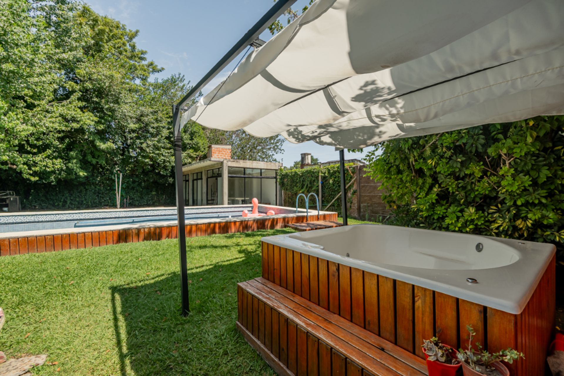 Country estate in Benavidez on a wooded lot of 1,120 m², available for move‑in. The property features a 12.50 × 4 m pool and a 1.90 × 1.90 m Jacuzzi, a covered barbecue area with grill, bathroom and toilet, a 10 × 4.5 m fully glazed patio, a clay oven, children’s play area and large green spaces. The garden is illuminated for nighttime gatherings and has an automatic irrigation system, cameras and alarm. The uncovered front parking allows three vehicles and electricity, water, sewage and internet services are available. The house uses bottled gas and is pet‑friendly. Inside, the 6‑room house includes a 3‑bedroom apartment, highlighting one on the upper floor measuring 5 × 2.90 m with an ensuite bathroom. The layout is modern.