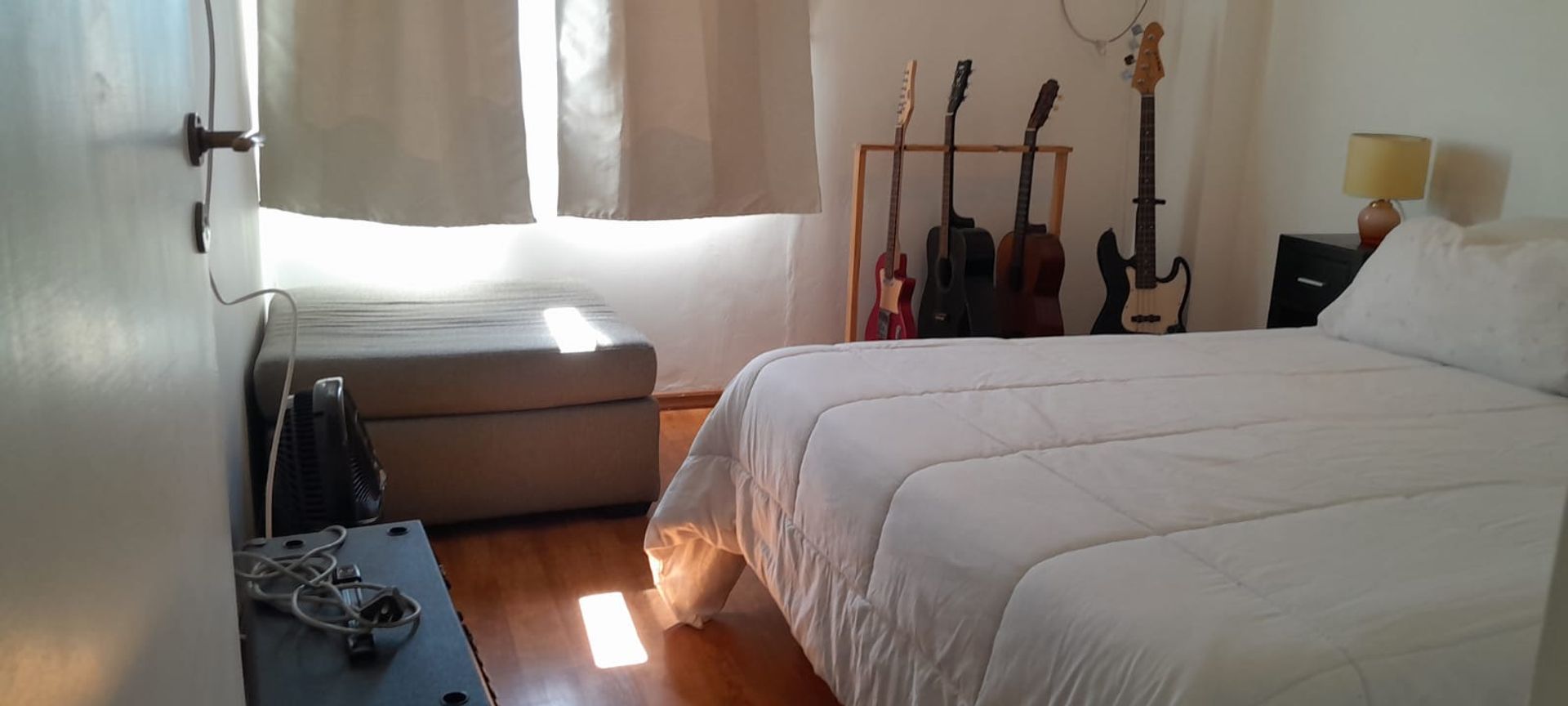 From the living area, a distribution corridor leads to a large wardrobe with ample storage space. Its interior includes drawers and wooden shelves, facilitating organization and space utilization. Two comfortably sized bedrooms with floating floors provide a relaxed, modern ambiance.