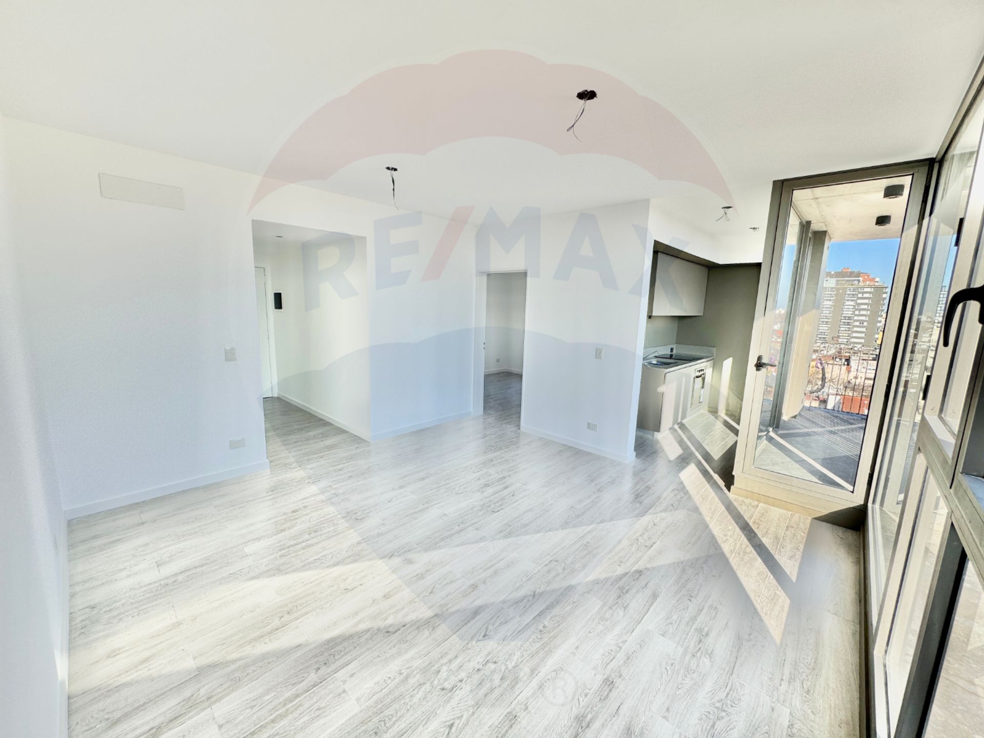 The kitchen, positioned on the side of the living area, maintains visual independence while allowing smooth circulation. It features direct balcony access, excellent ventilation, a vitreous ceramic hob, electric oven, ample cabinetry, refrigerator space, and a functional work area.
