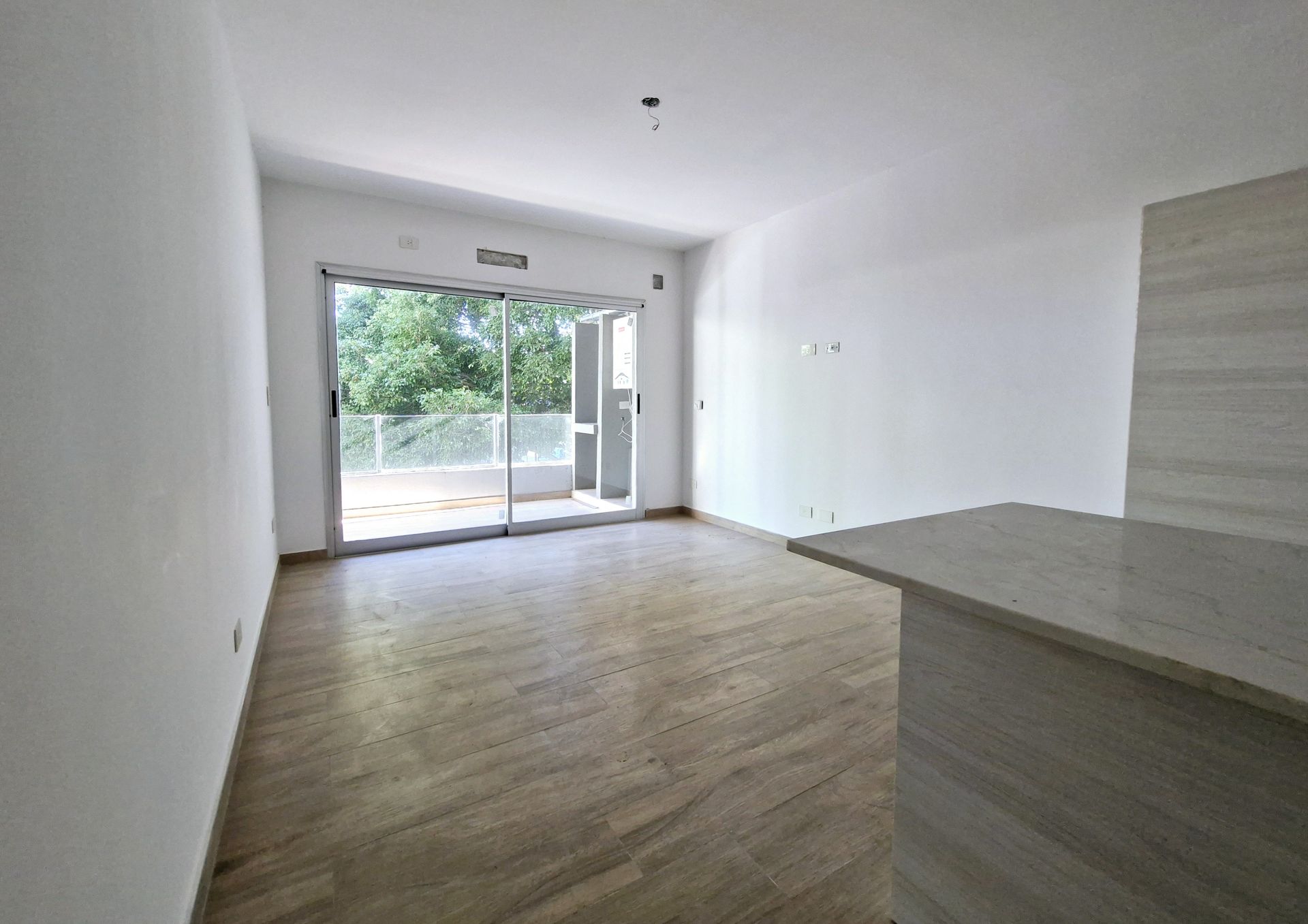 The layout is functional and bright: a spacious living‑dining area with large windows and natural ventilation, opening onto a private expansion; a continuous terrace balcony at the front of Av. del Libertador, with space for a personal grill and beautiful views of the green trees. The semi‑integrated kitchen features a breakfast island, Silestone countertop, gas stove with stainless steel extractor hood and laundry connection. The hallway leads to the bedroom, which has a 3‑leaf melamine wardrobe and a large window opening onto the balcony. The full bathroom, semi‑suite, includes a bathtub, modern vanity and exhaust ventilation.