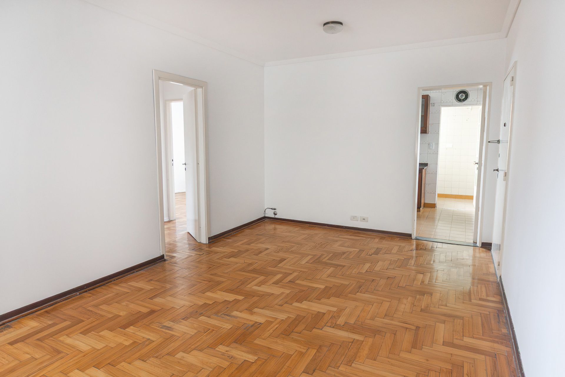 The living room and dining area are presented as a spacious open area, featuring hydro-alkyd lacquered wood flooring that adds warmth and elegance. The space is fitted with blinds on the windows and a balanced vent heater that ensures comfort throughout the year.