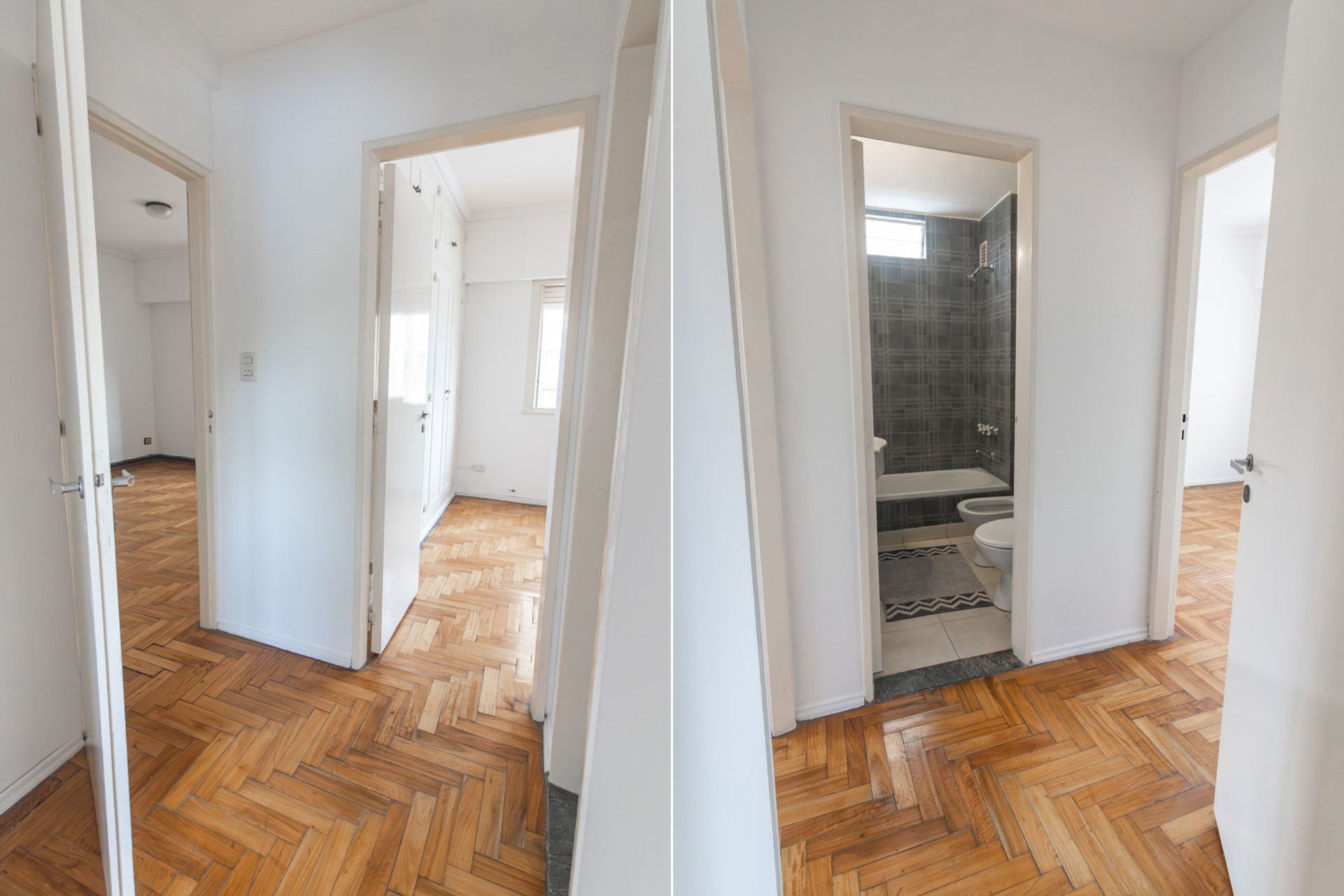Two bedrooms, one facing front and the other at the rear, feature floor-to-ceiling wardrobes and hydro-alkyd lacquered wood flooring. Both rooms are fitted with blinds, ensuring privacy and light control.