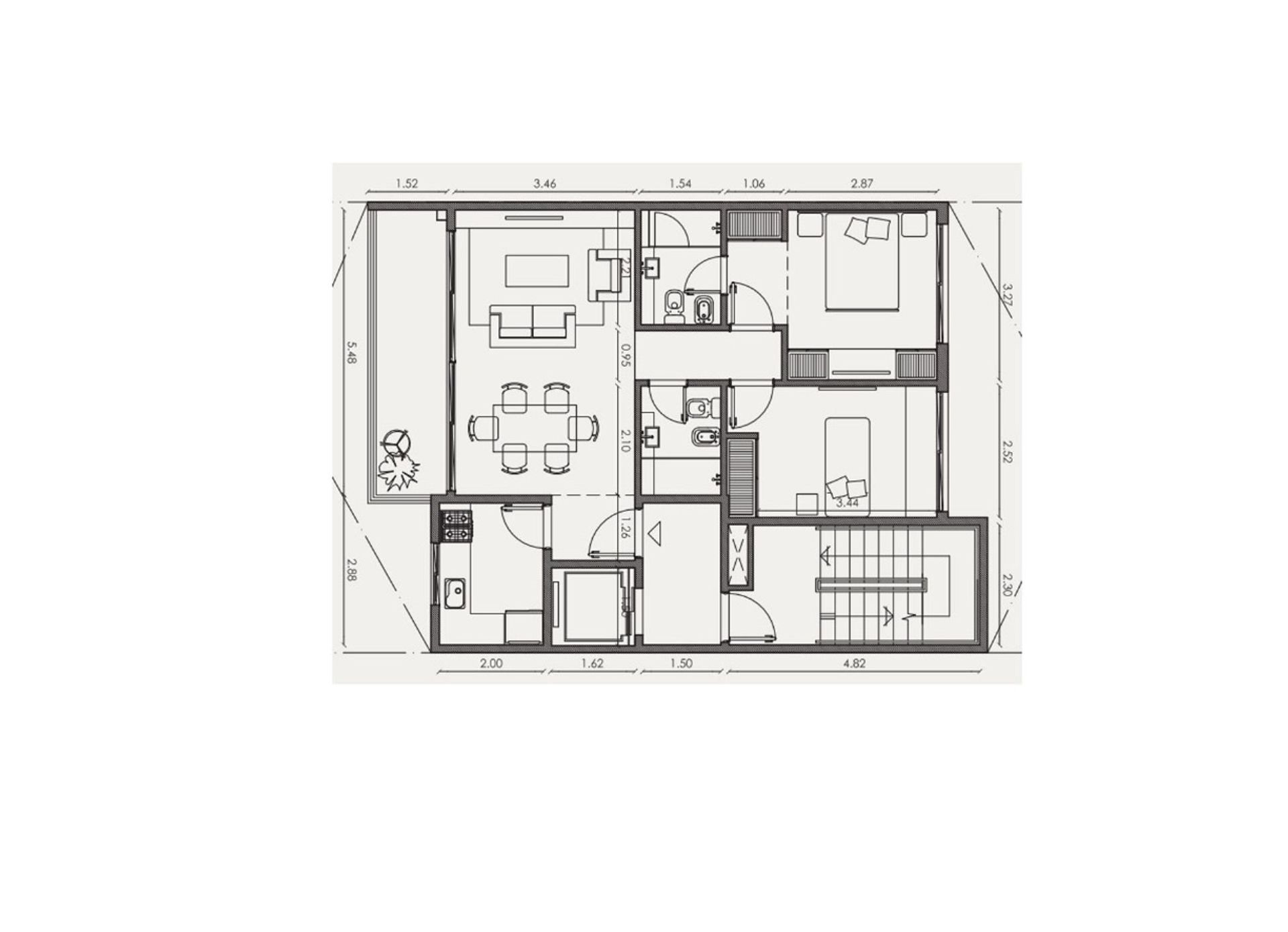 The living‑dining room, 3.46 × 5.26 m, offers a bright and spacious environment, ideal for gatherings and moments of rest. Moving out of this area, the balcony, 1.52 × 5.48 m, opens onto the street, providing a pleasant view and connection with the outdoors. The kitchen, separate and 2.00 × 2.88 m, is designed for practicality and culinary inspiration.