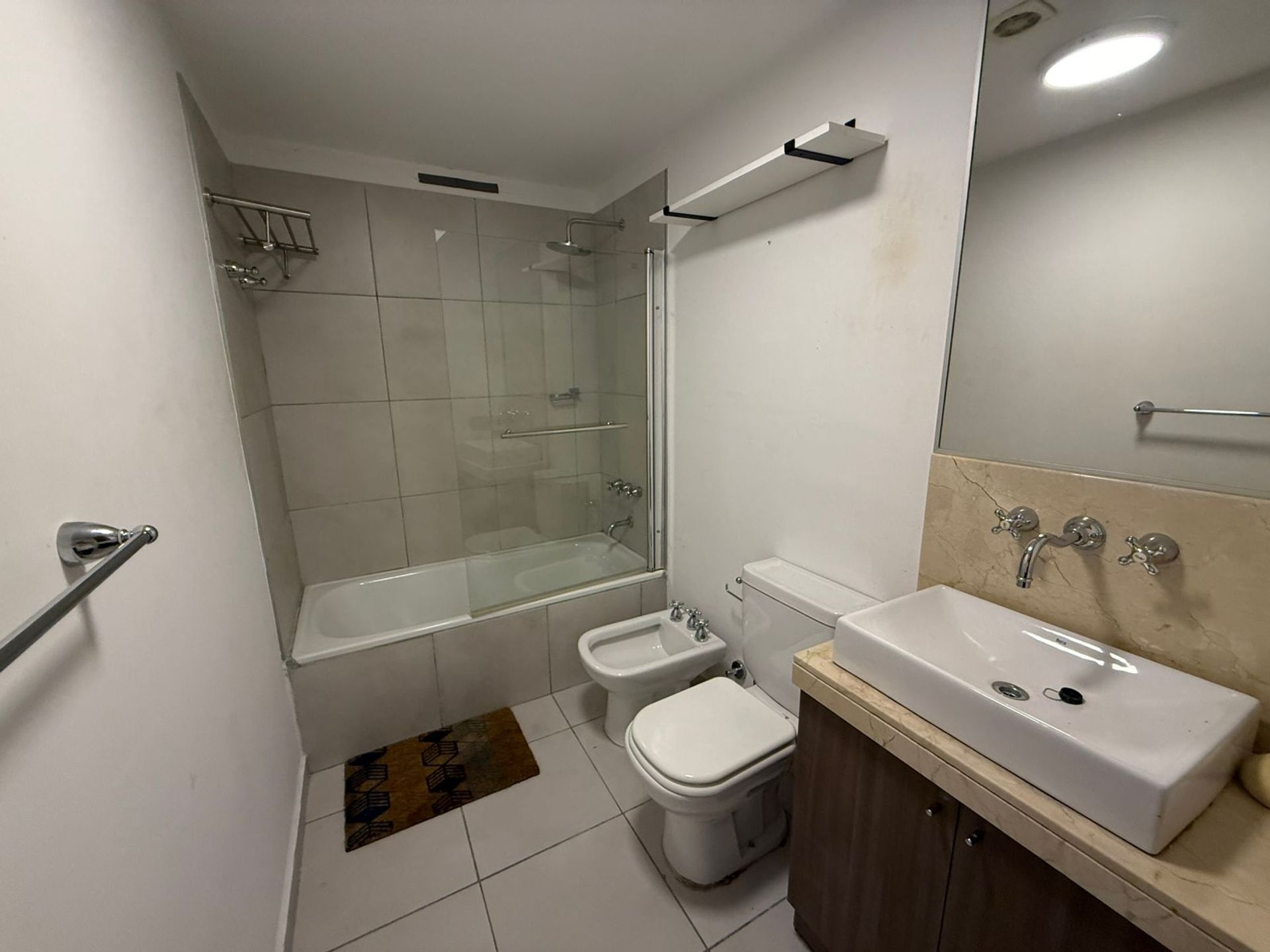 The kitchen is integrated in a modern and practical manner, equipped with cabinets, base cabinets, and a functional countertop. It includes connections for appliances, facilitating the installation of a washing machine or other devices as needed. The full bathroom boasts quality finishes and good ventilation.