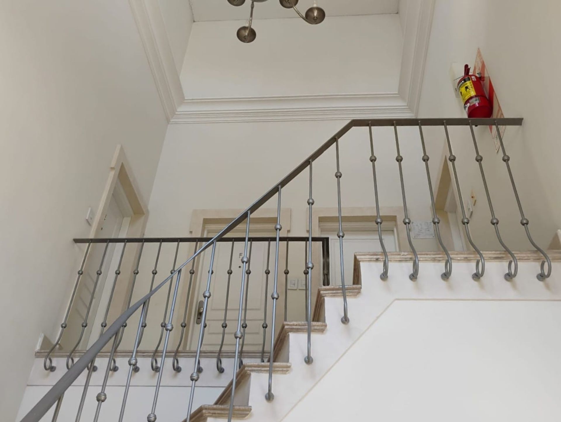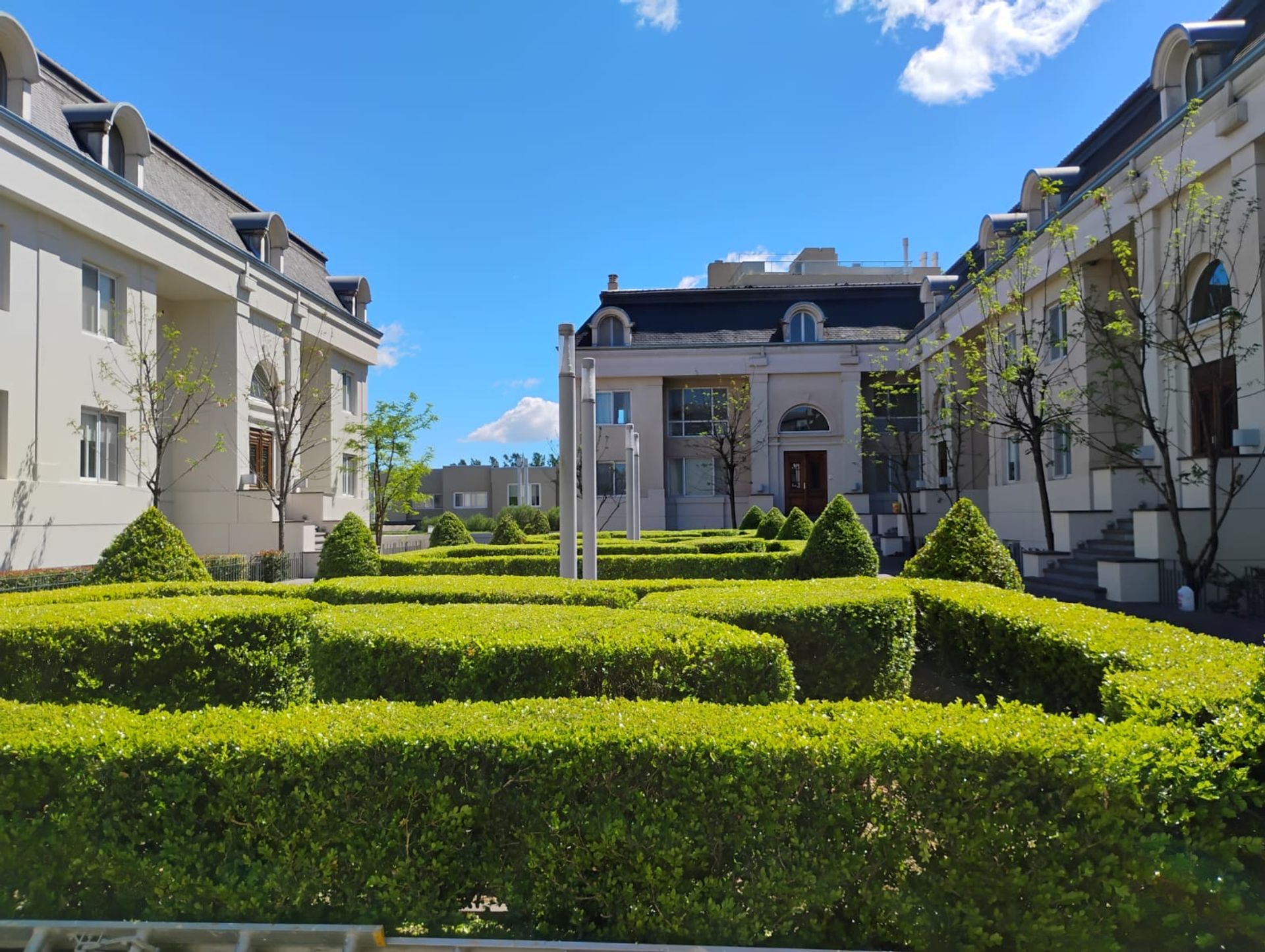 Access is made via an external staircase surrounded by pines that create a unique atmosphere. The triple‑height living room provides a sense of spaciousness, with floor‑to‑ceiling windows that allow constant natural light and panoramic views of the complex’s green spaces.