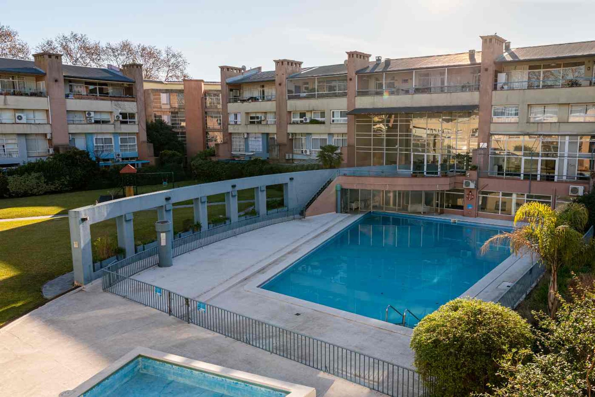 Amenities include a panoramic solarium with views of the gardens and pool, a large central pool, a children’s pool, a gym, an art room, a covered area designated for children’s play, and a playground in the park. The laundry room is equipped with high‑capacity washer and dryer units. Additionally, the multipurpose room includes a kitchen, refrigerator, two air conditioning units, and views of the pool and park.