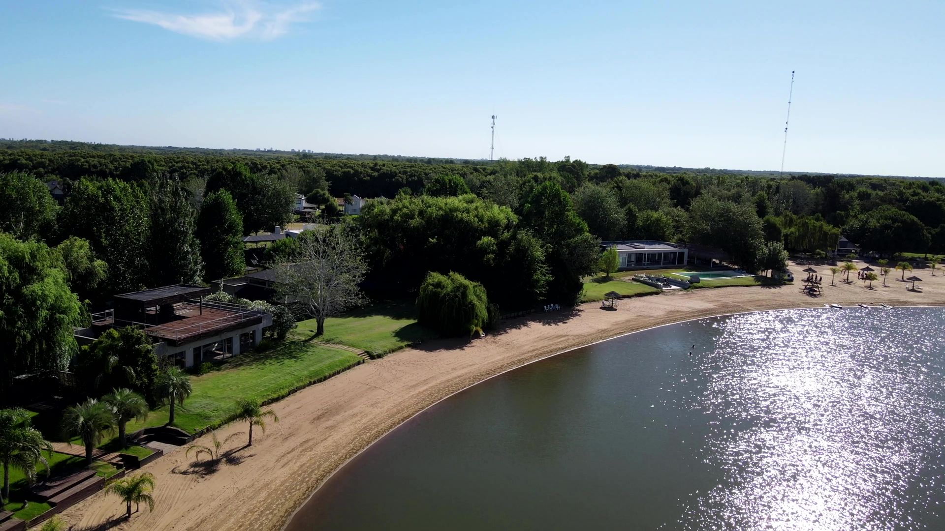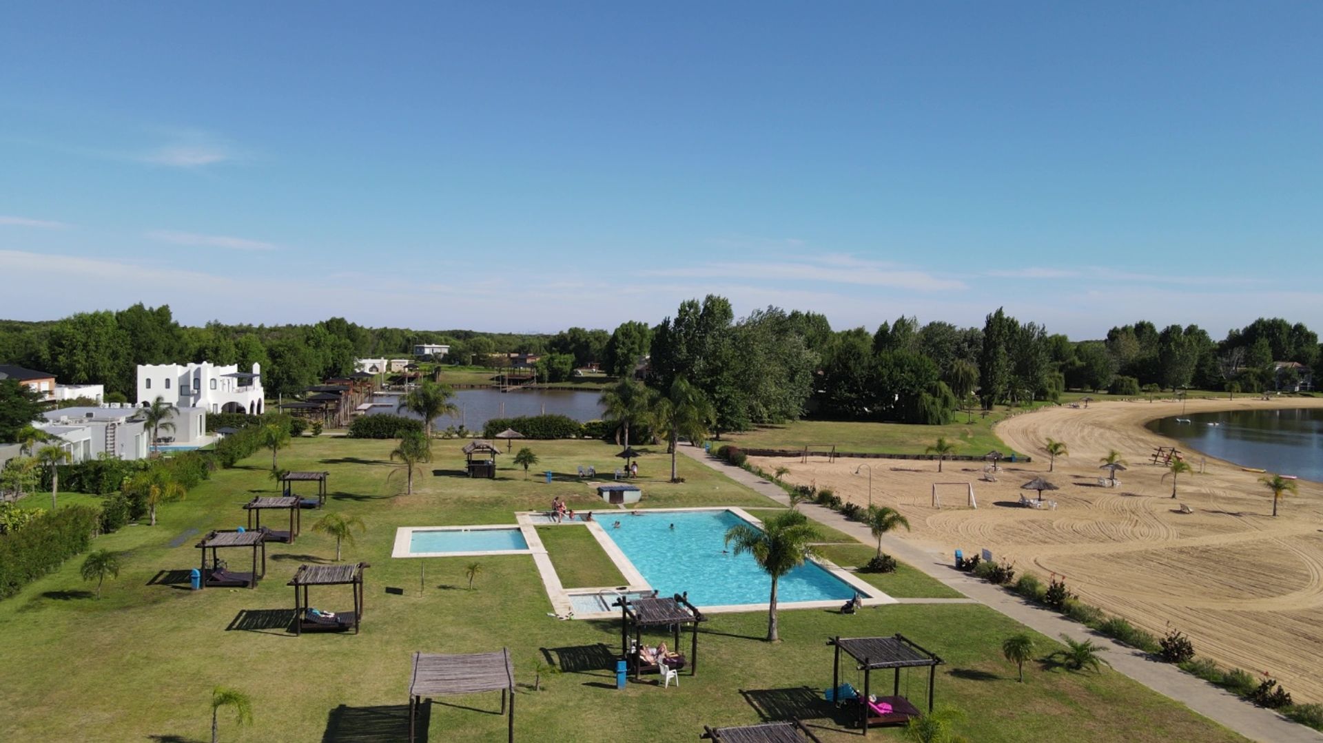 The area is characterized by its sun-shaped layout, featuring a central lagoon 300 m in diameter and 18 m deep, whose crystal‑clear waters are surrounded by a dock and an extensive sandy beach. The surroundings include loungers, umbrellas, and a pavilion, creating an ideal setting for recreation and enjoyment of nature.