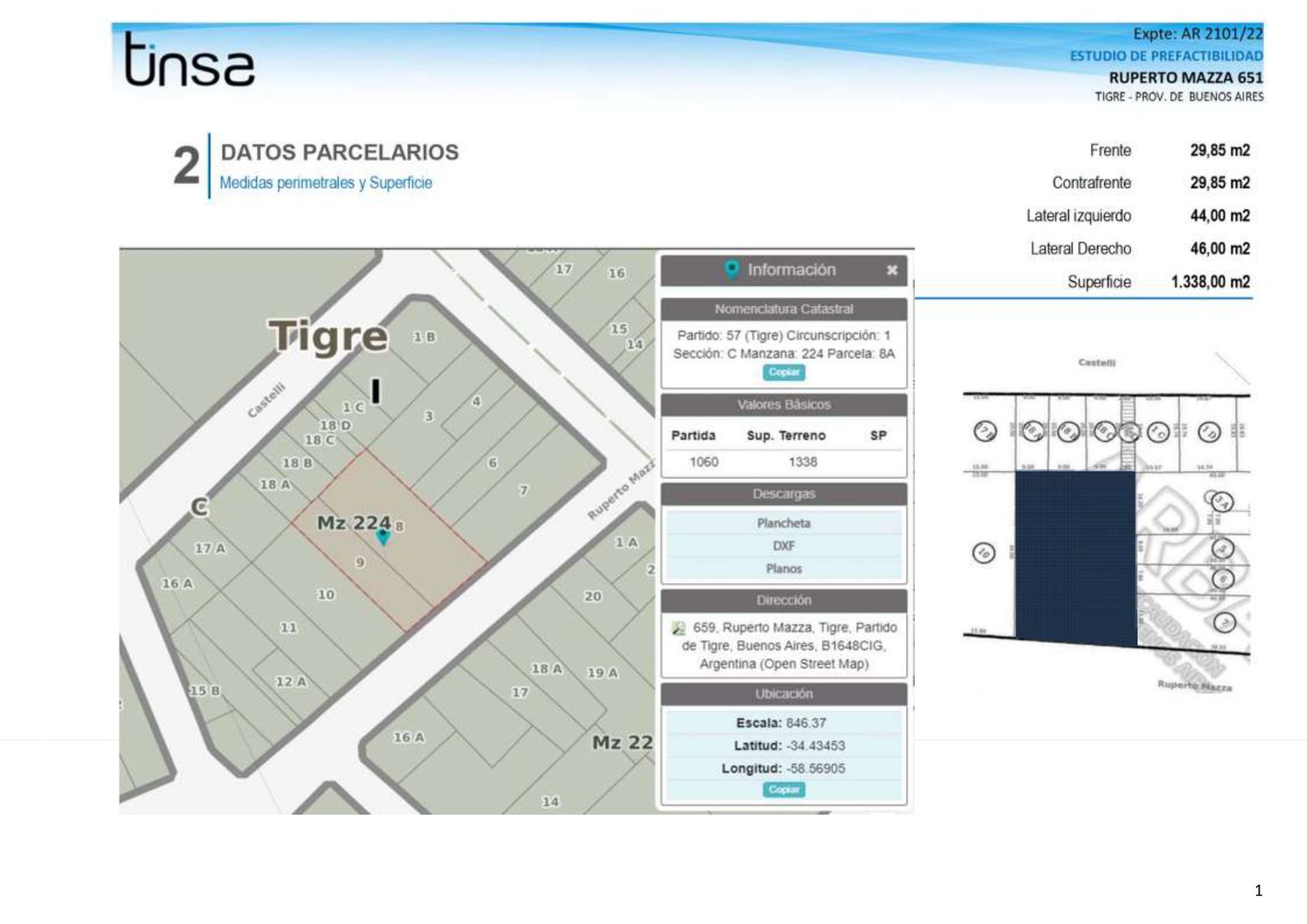 The plot features a frontage of 29.85 m² and a back frontage of equal size, with side walls of 44 m² and 46 m², totaling a gross area of 1,338 m². The buildable area reaches 4,014 m², with a basic Floor Area Ratio (FAR) plus a width bonus of 3.00. The incidence is estimated at USD 174, supporting the project's viability.