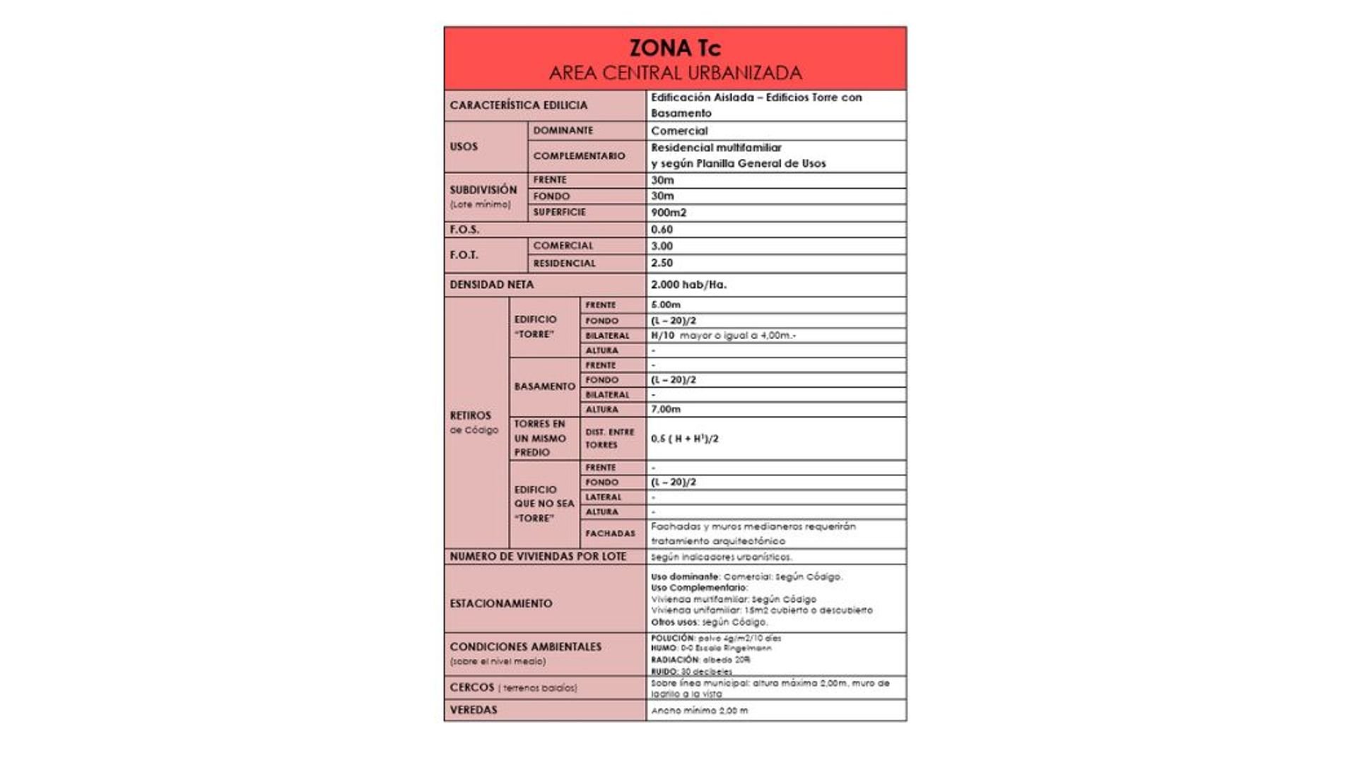 The lot presents a frontage of 13 m and a depth of 34.90 m, with a total area of 596 m². It is zoned as TC – Central Urbanized Area, with a residential FOT of 2.5 and an FOS of 0.60. The estimated net density is 2,000 inhabitants per hectare, and the permitted height reaches the ground floor plus eight stories, with an urban bonus of +25 % over the FOT.
