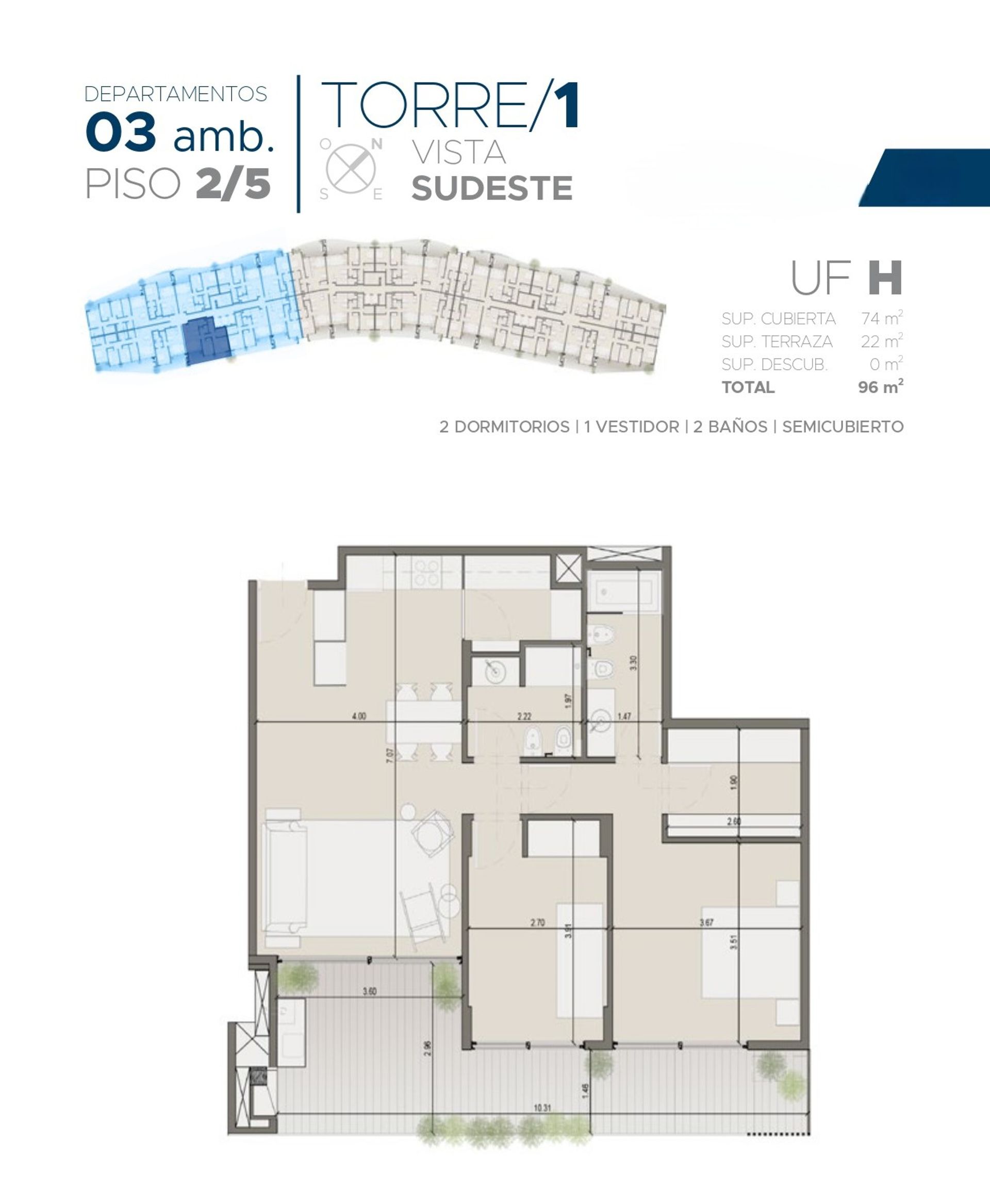 The 3‑room functional unit, located on the second floor of Tower 1, offers 74 m² of built‑up area and 22 m² of semi‑covered terrace, totaling 96 m² of living space. The layout includes a spacious living‑dining area with a semi‑integrated kitchen, an en‑suite bedroom with walk‑in closet and full bathroom, and a second full bathroom. The rooms open onto the terrace through large PVC double‑glazed windows, ensuring abundant natural light and optimal thermal insulation. Heating is provided by radiant slab, while high‑end cold‑heat air‑conditioners guarantee year‑round comfort. The unit includes a 12.5 m² garage and a 3.18 m² storage room.