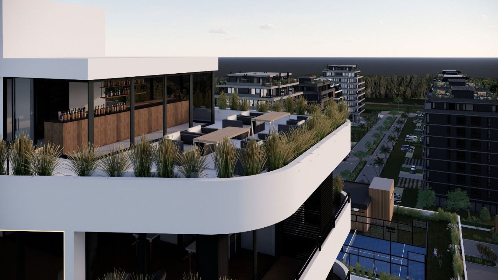 Offices and apartments with balcony, adjacent to commercial spaces, in the new residential complex in Doral, located on Av. Italia between the neighborhoods of Nordelta and Villanueva. The architecture blends commercial spaces with modern-style residences, offering expansive balconies that invite residents to enjoy natural light and panoramic views of the surroundings.