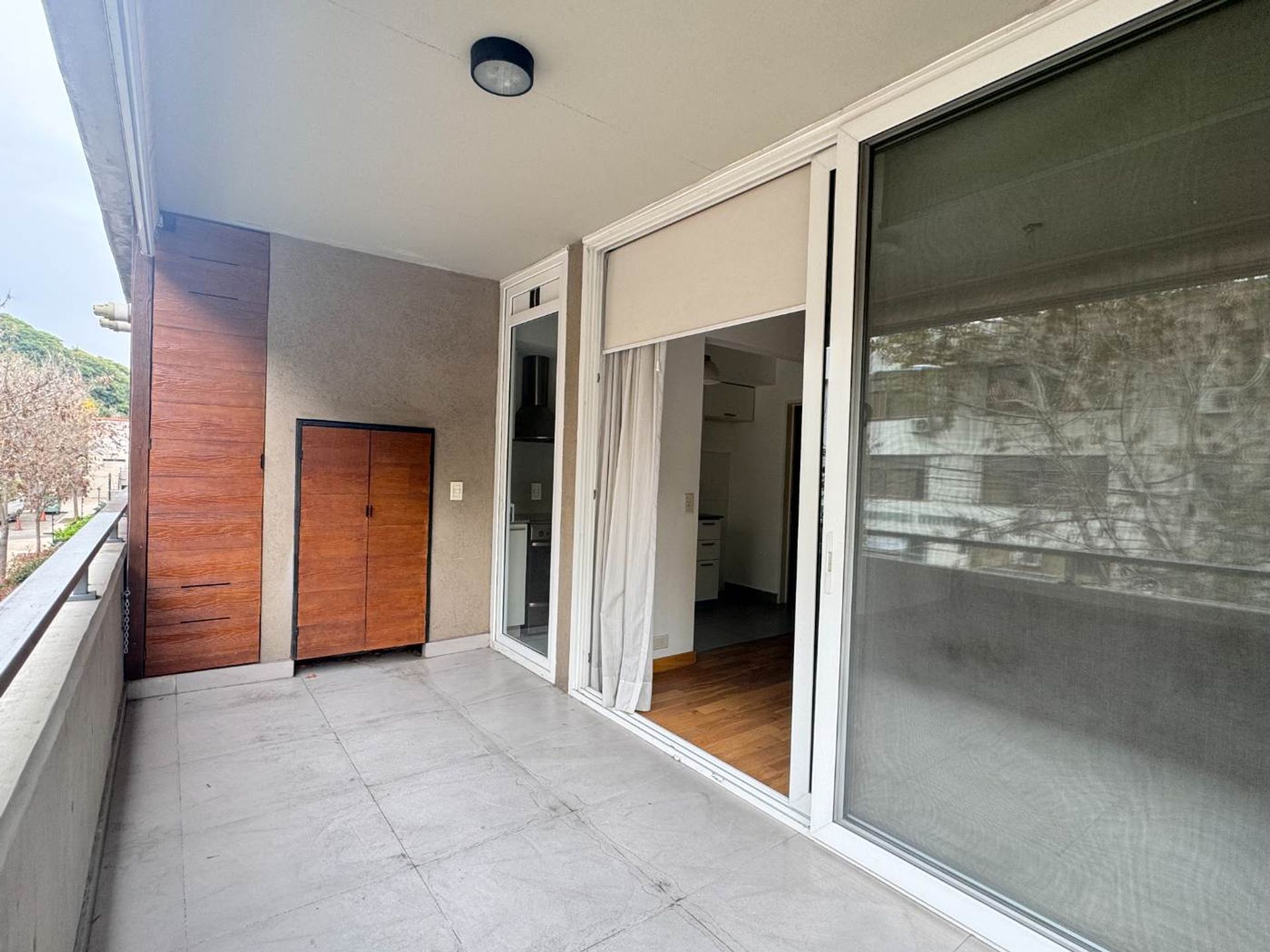 Standard 1‑bedroom apartment located in the DOUX building, at the corner of Francisco Melo and Francisco Beiró, just steps from the entrance to the Panamericana. The unit is on the first floor and features a spacious living‑dining area finished with Patagonia Flooring floating floors. From the living area you can access a balcony with grill, offering a pleasant view of Melo street.
