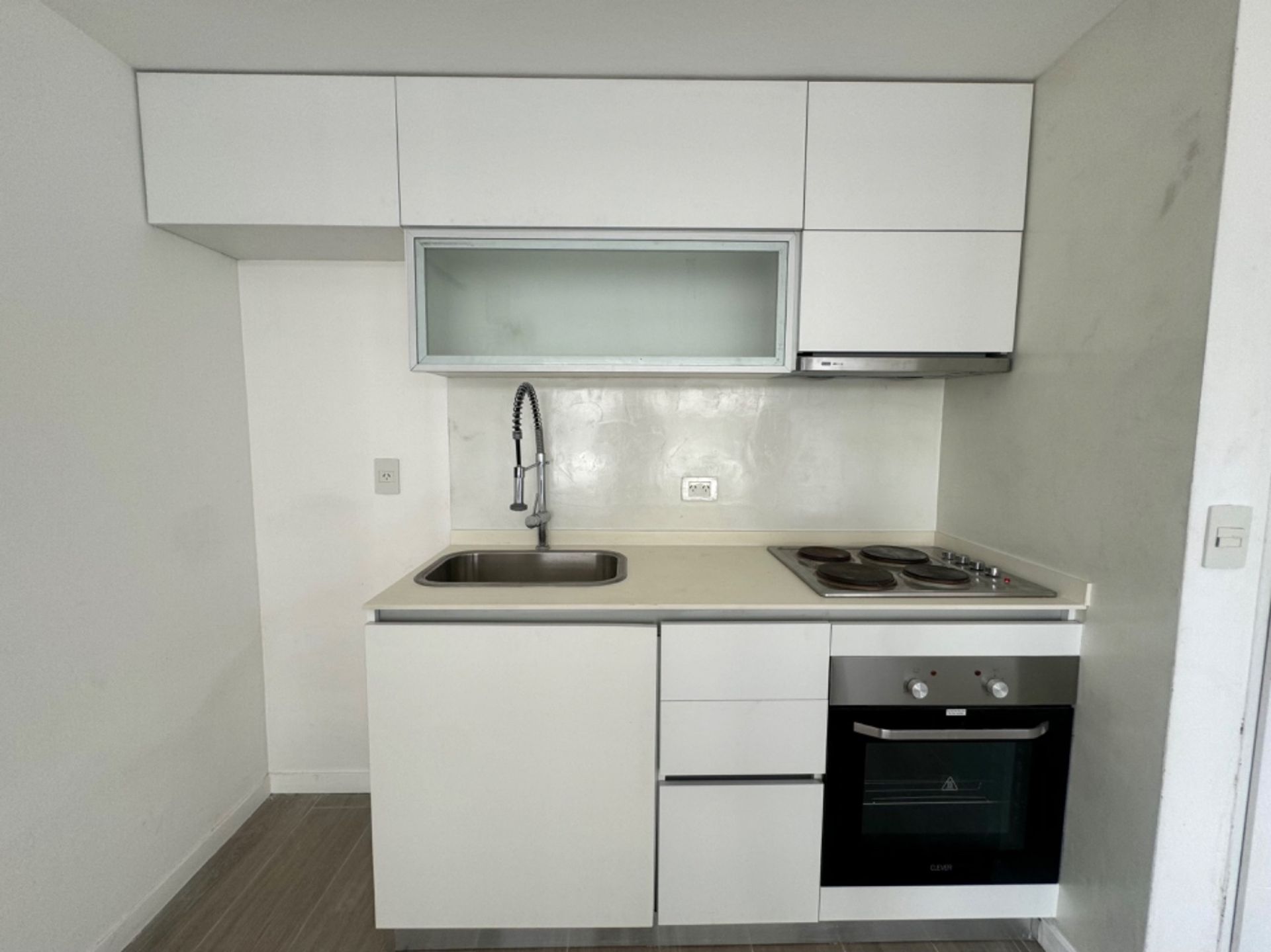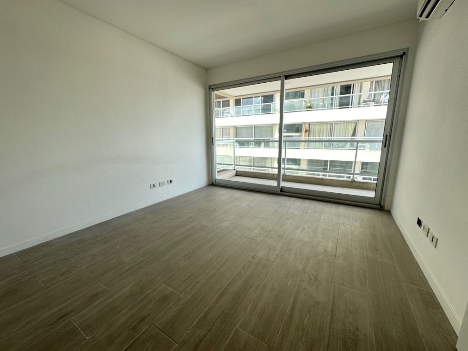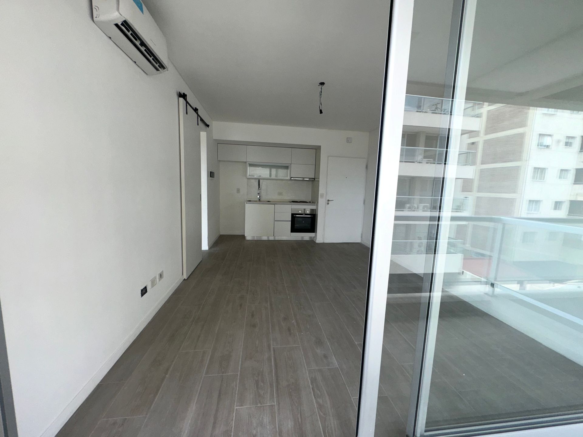 Upon entry, the expansive living‑dining area opens onto a walk‑in balcony, creating an airy and bright ambience. The kitchen, integrated with the living room, features high and low cabinetry, silestone countertops, vitreous ceramic hob, electric oven, and extractor fan, complemented by heating/cooling air conditioning and wood‑look porcelain tiles. A pantry door separates the living room from the bedroom access, which boasts a large wardrobe with interior shelving, pre‑installation for air conditioning, and a window opening onto the walk‑in balcony. The full bathroom, with bathtub and shower screen, includes an extractor fan and porcelain tiles.