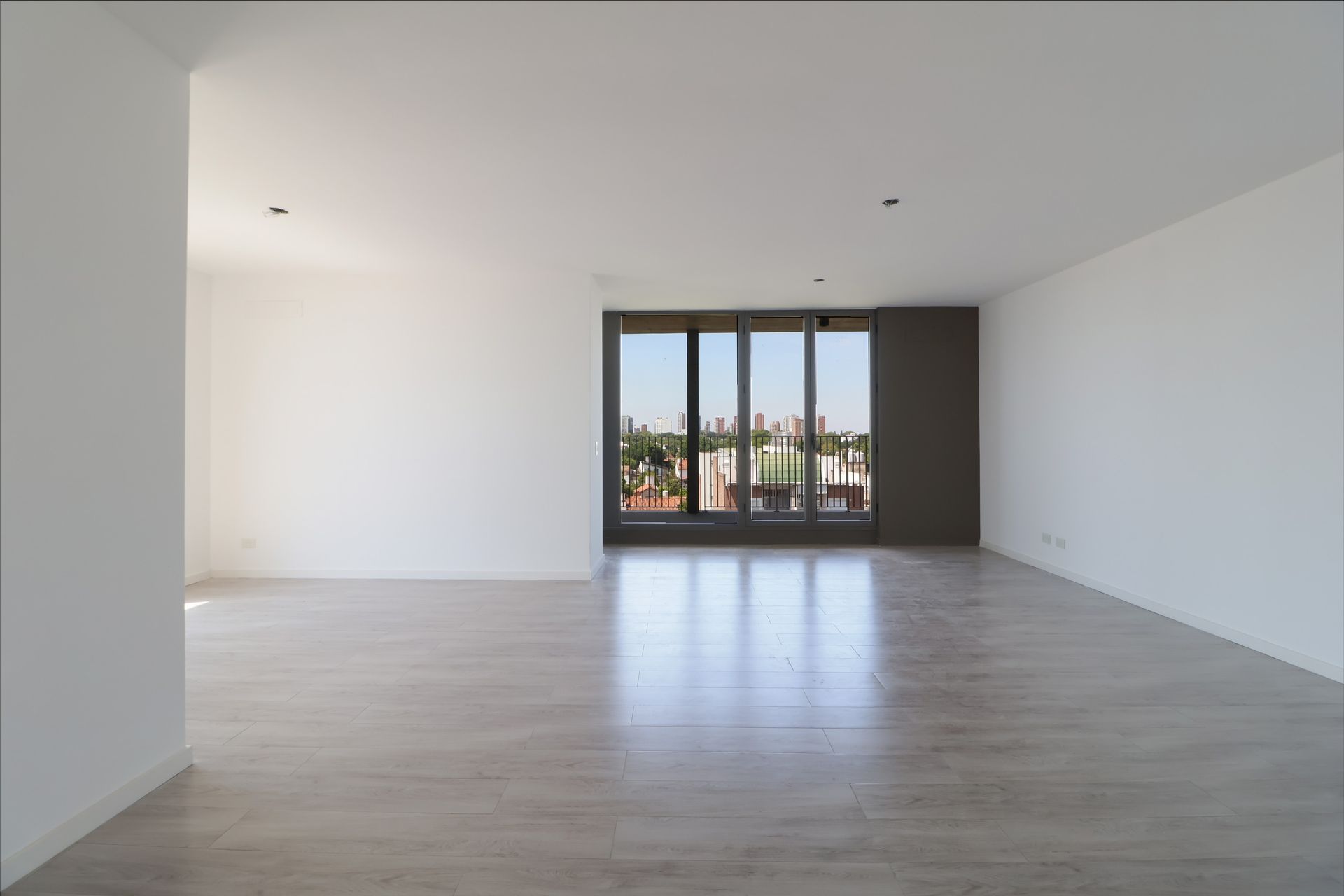 The master bedroom is configured as a suite, while the second bedroom has the option to be enclosed; currently integrated into the living area, it allows for either two defined bedrooms or a large living‑dining space, ideal for both residential and professional use.