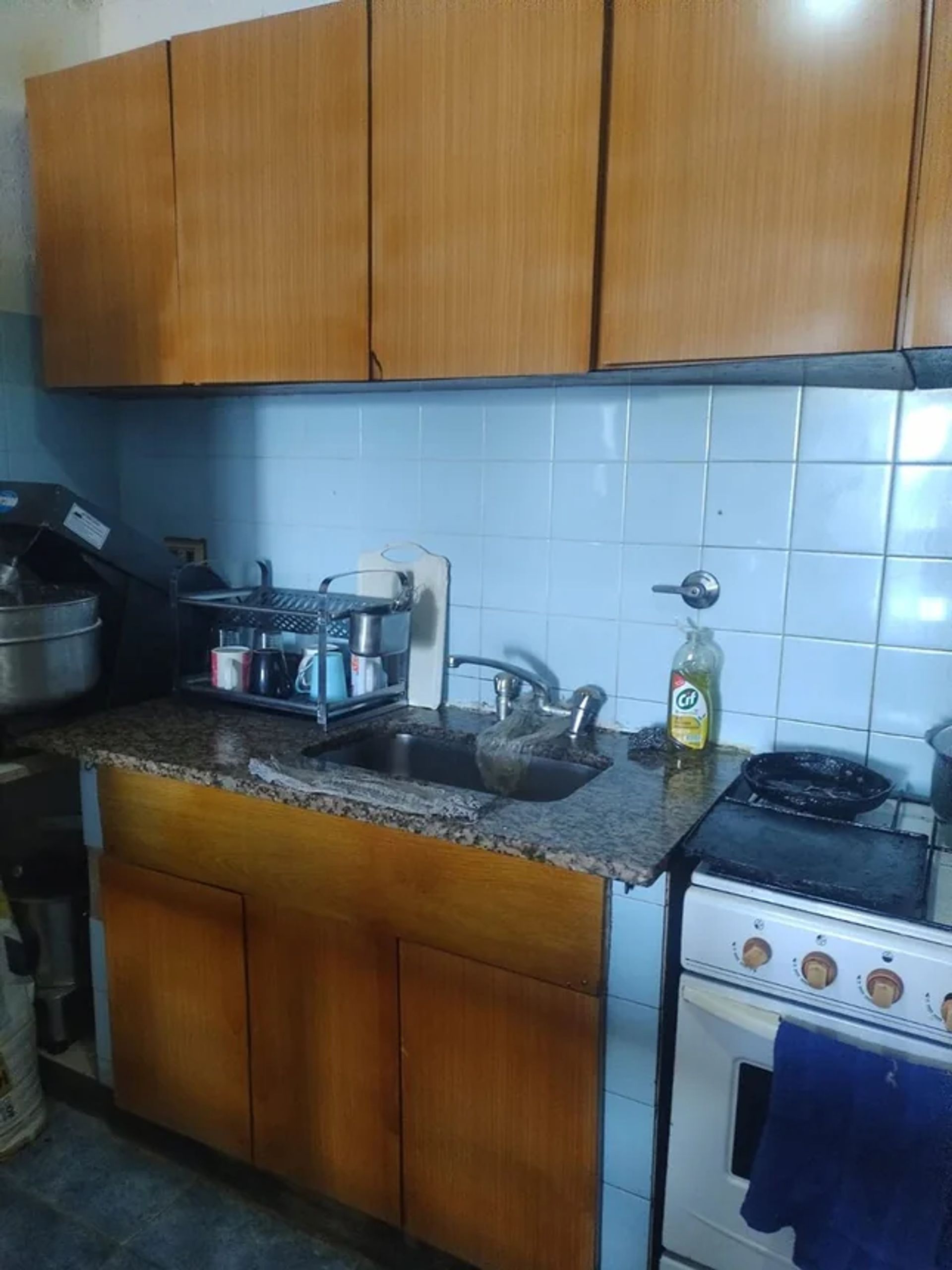 Upon entry, a wide, bright living‑dining area opens, with large windows allowing natural light and direct access to the balcony. The kitchen is fully equipped: low‑profile cabinetry, island with aluminum countertop, gas burners and oven, delivering functionality and style. The separate laundry area facilitates household chores.
