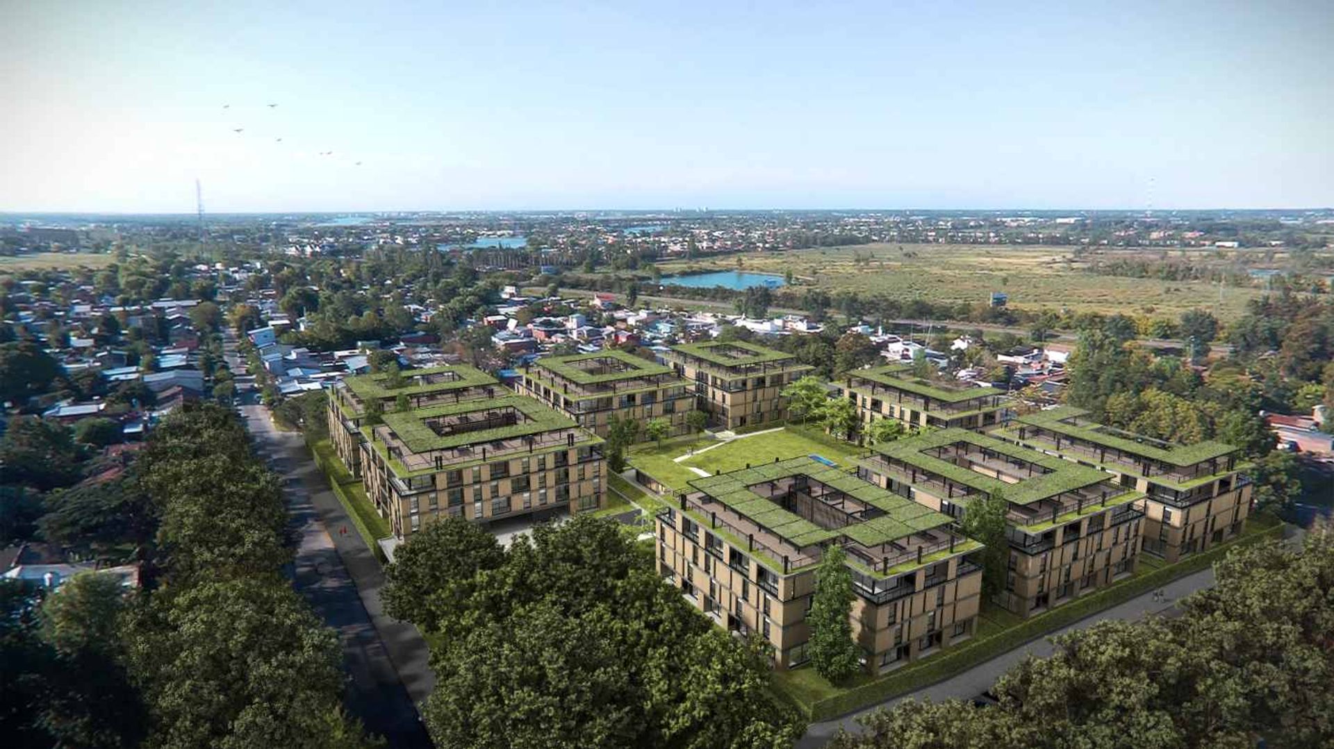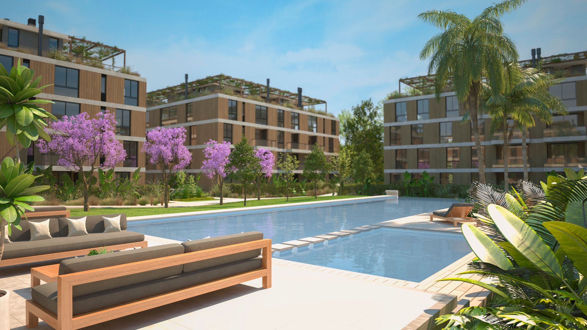 The development comprises eight four‑storey buildings on 15,500 m² of land, surrounded by an impressive wooded area and a reflecting pool. The architecture promotes natural light and offers high‑quality interior and exterior views.