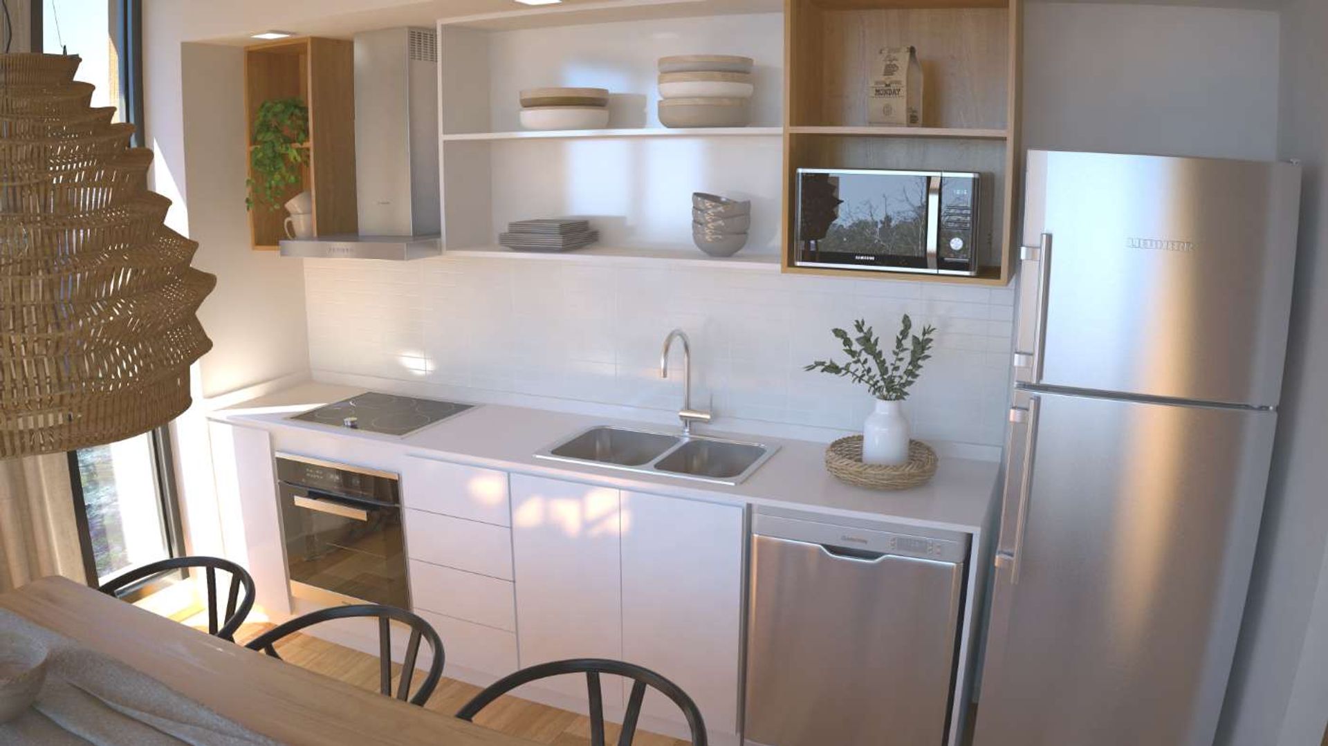 The kitchen has a Silestone white North countertop with baseboard, white lacquered melamine lower cabinets, and full equipment including an electric oven and a dishwasher from Candy/Ariston or higher. It includes a double Johnson pool (model 6218 or 5218) and a stainless‑steel pool. The finish is Aquarela Finlandia model, the faucet is a first‑brand single‑handle or Peirano. The kitchen and living‑dining area have vinyl flooring, while the bedroom has wood‑simulated vinyl flooring and a sliding‑door wardrobe. All areas have installed air conditioning.