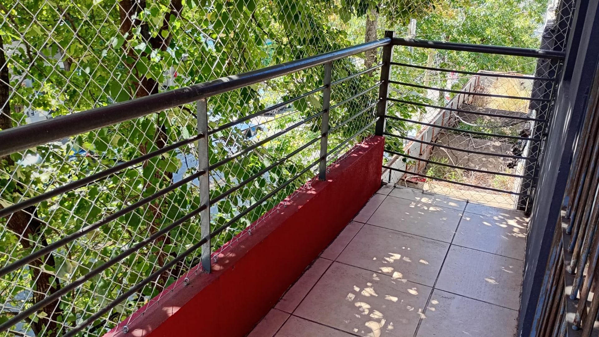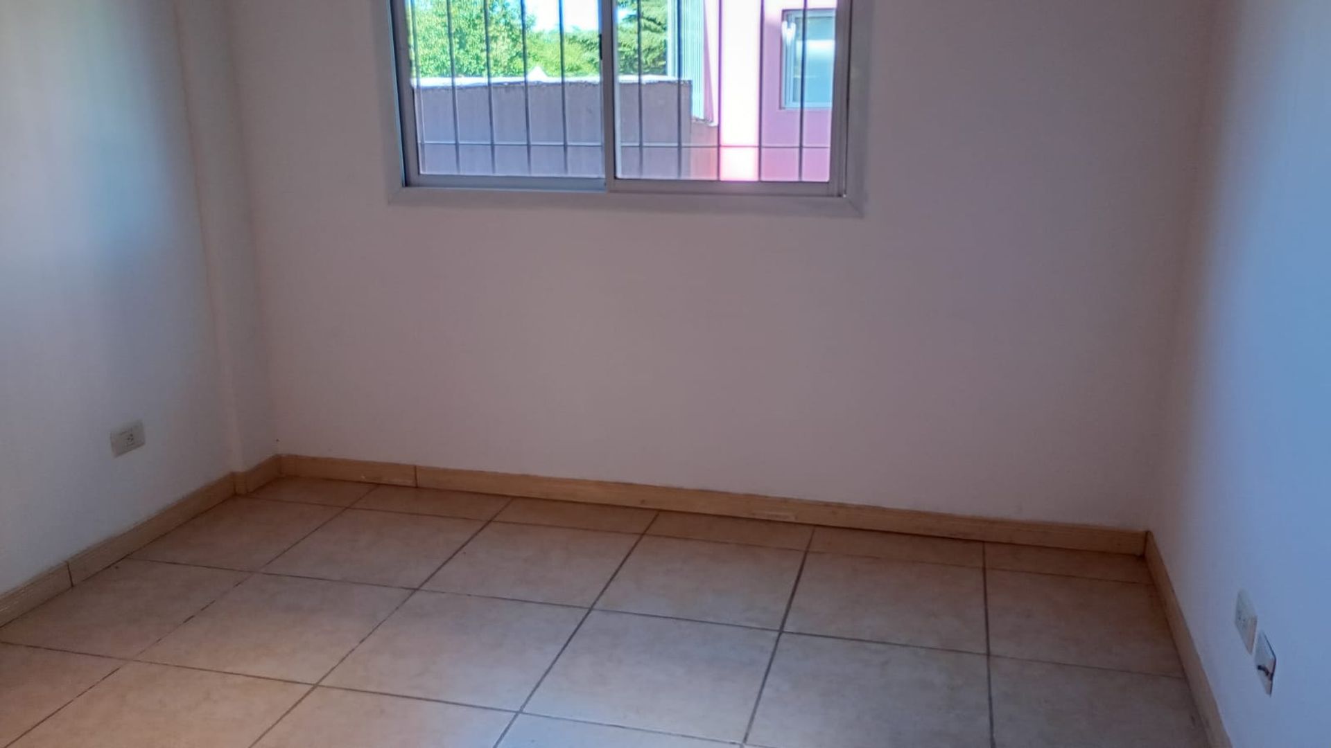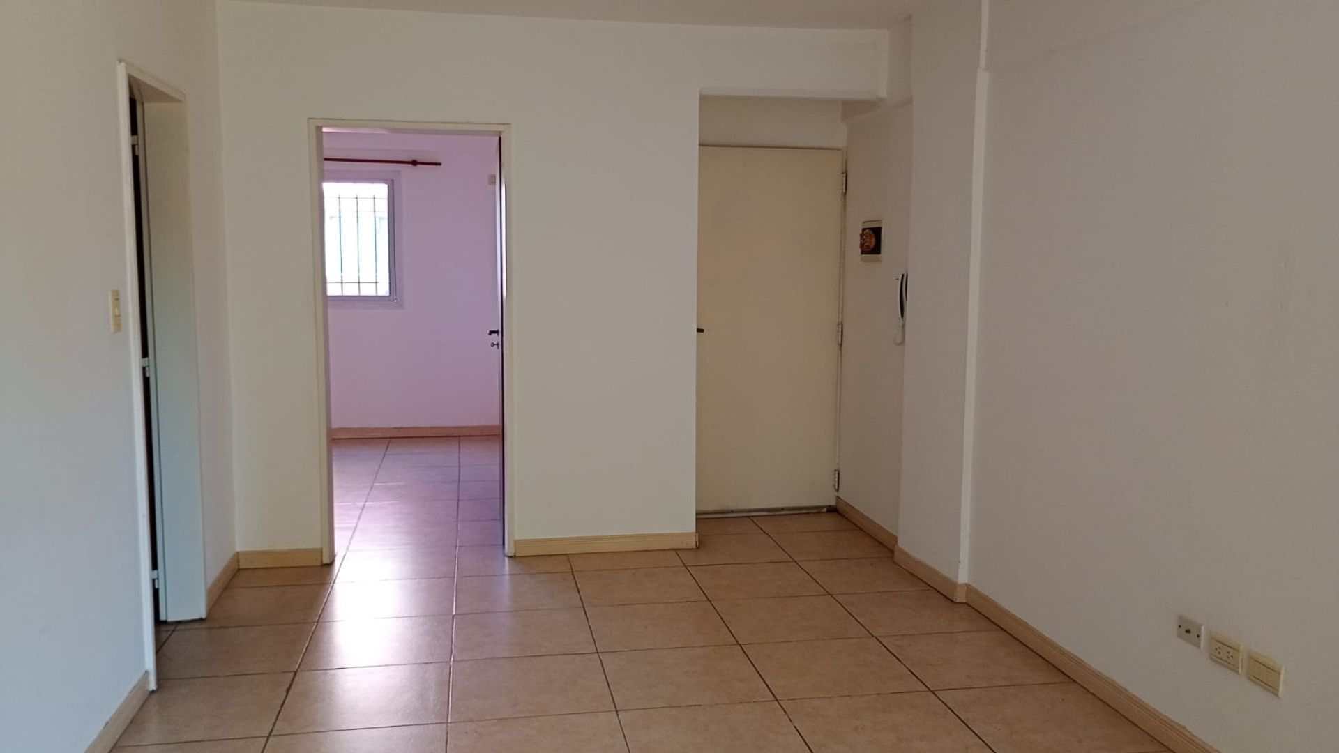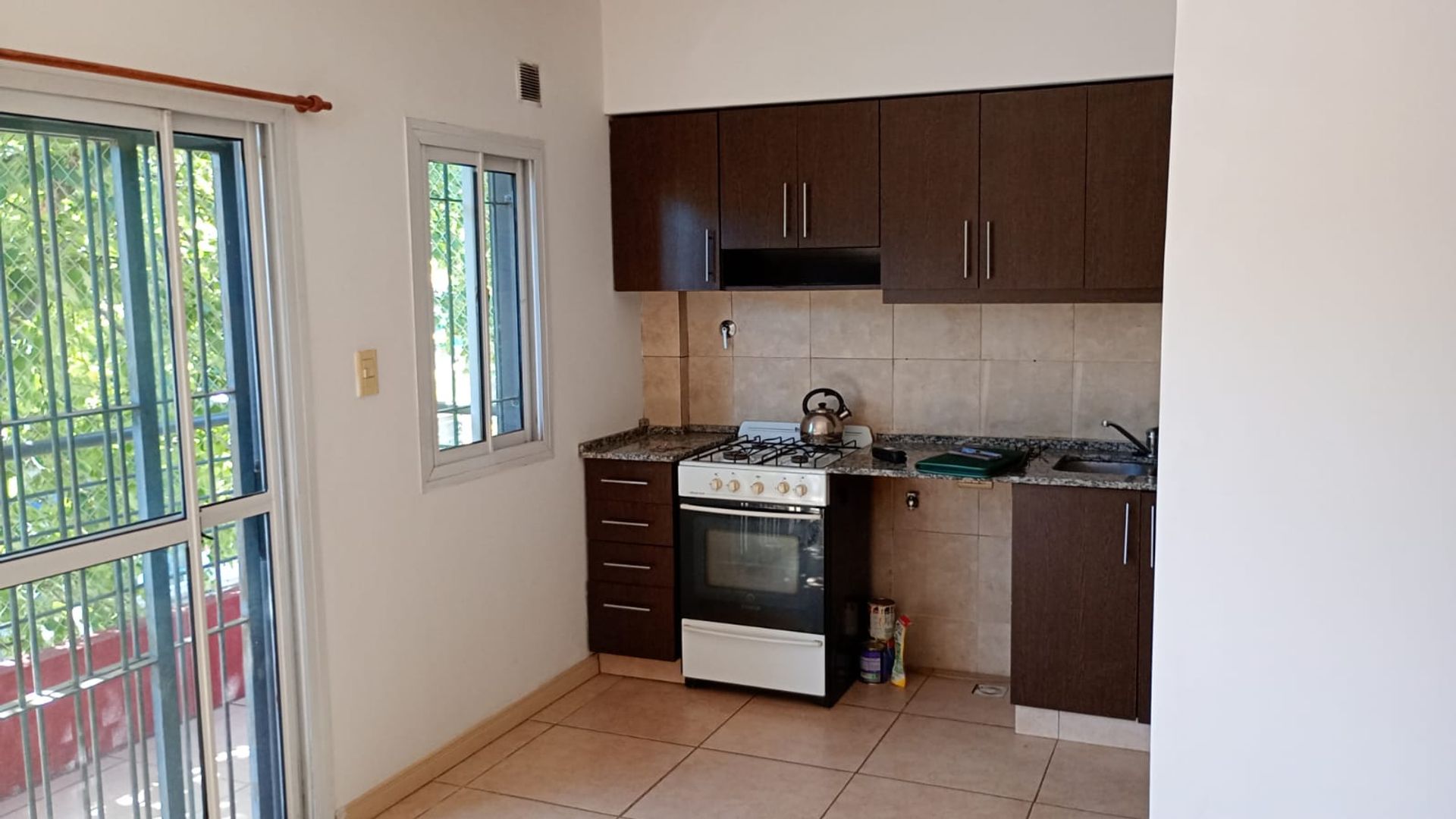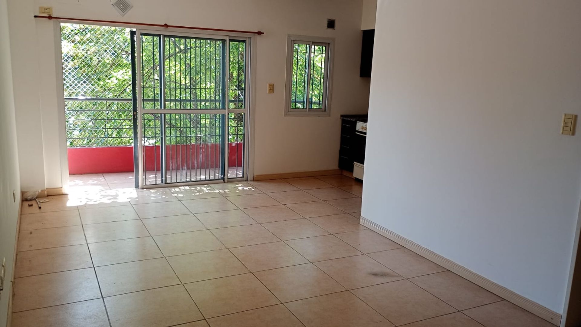 - Living‑dining with ceramic floors and a large window opening onto the front balcony.