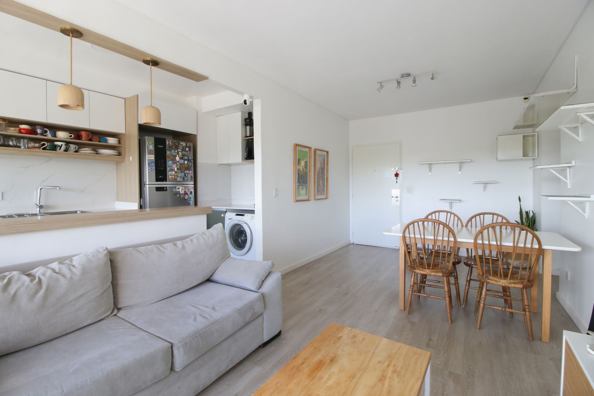 It is on the 5th floor and features a living-dining room with integrated kitchen, equipped with Purastone countertops, Johnson sink, and FV faucets. The laundry area is integrated, and the floor-to-ceiling