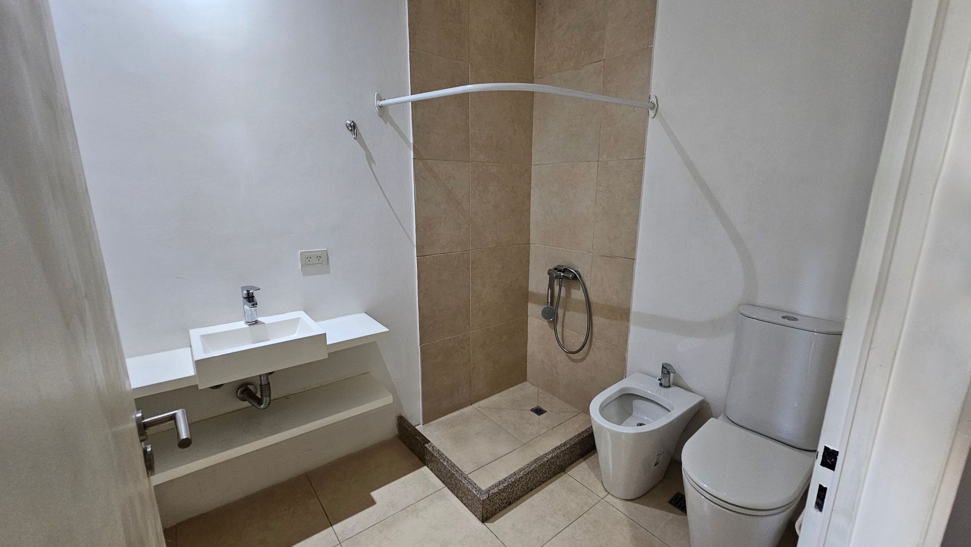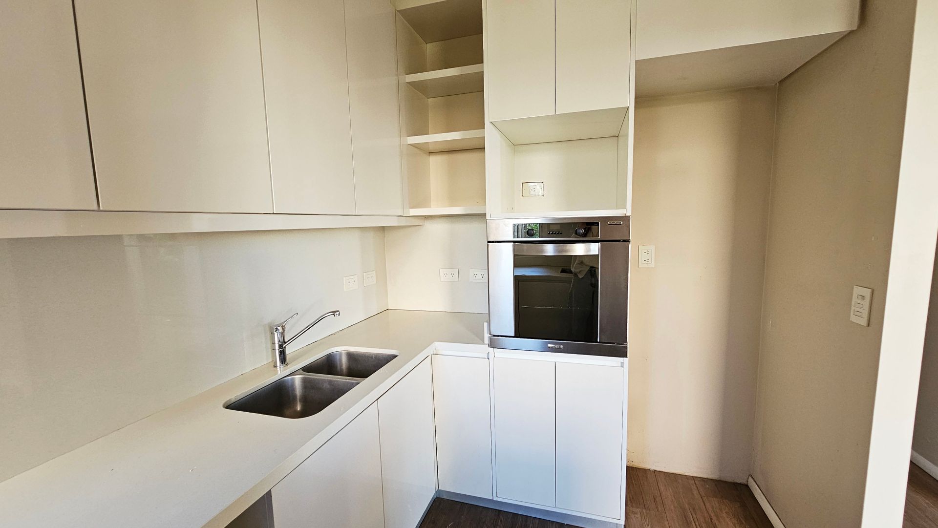 The apartment, redesigned to maximize spaciousness and natural light, features a double‑height living‑dining area and an integrated kitchen with lacquered cabinetry and silverstone countertop. An en‑suite bedroom with walk‑in wardrobe and heated bathroom with shower, a second full bathroom, and an additional room that can serve as a study or service space complete the offering.