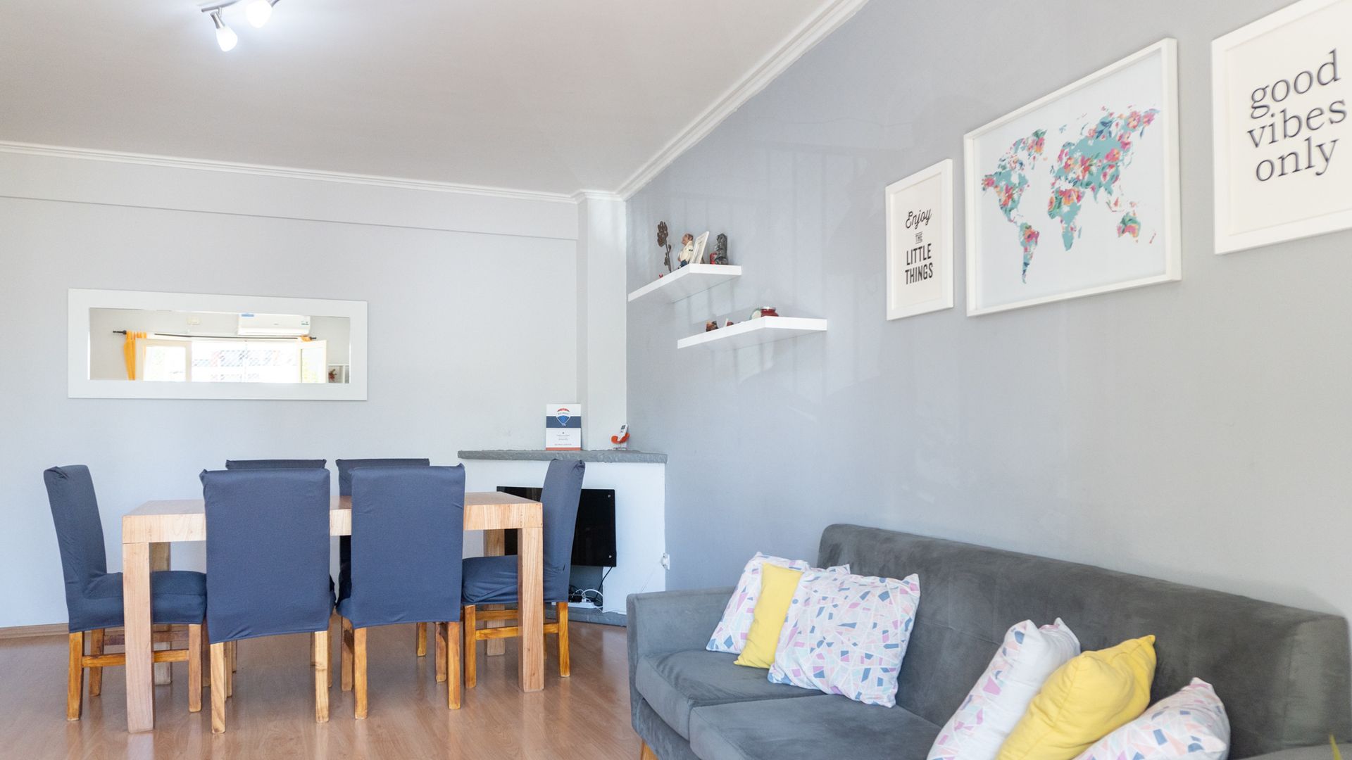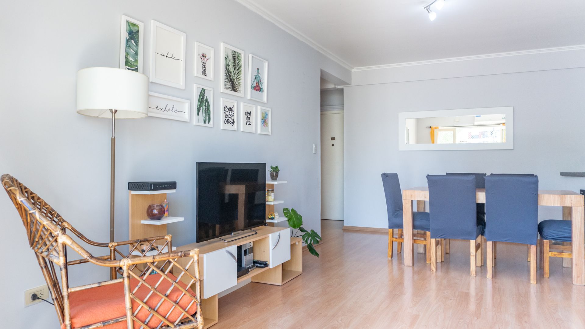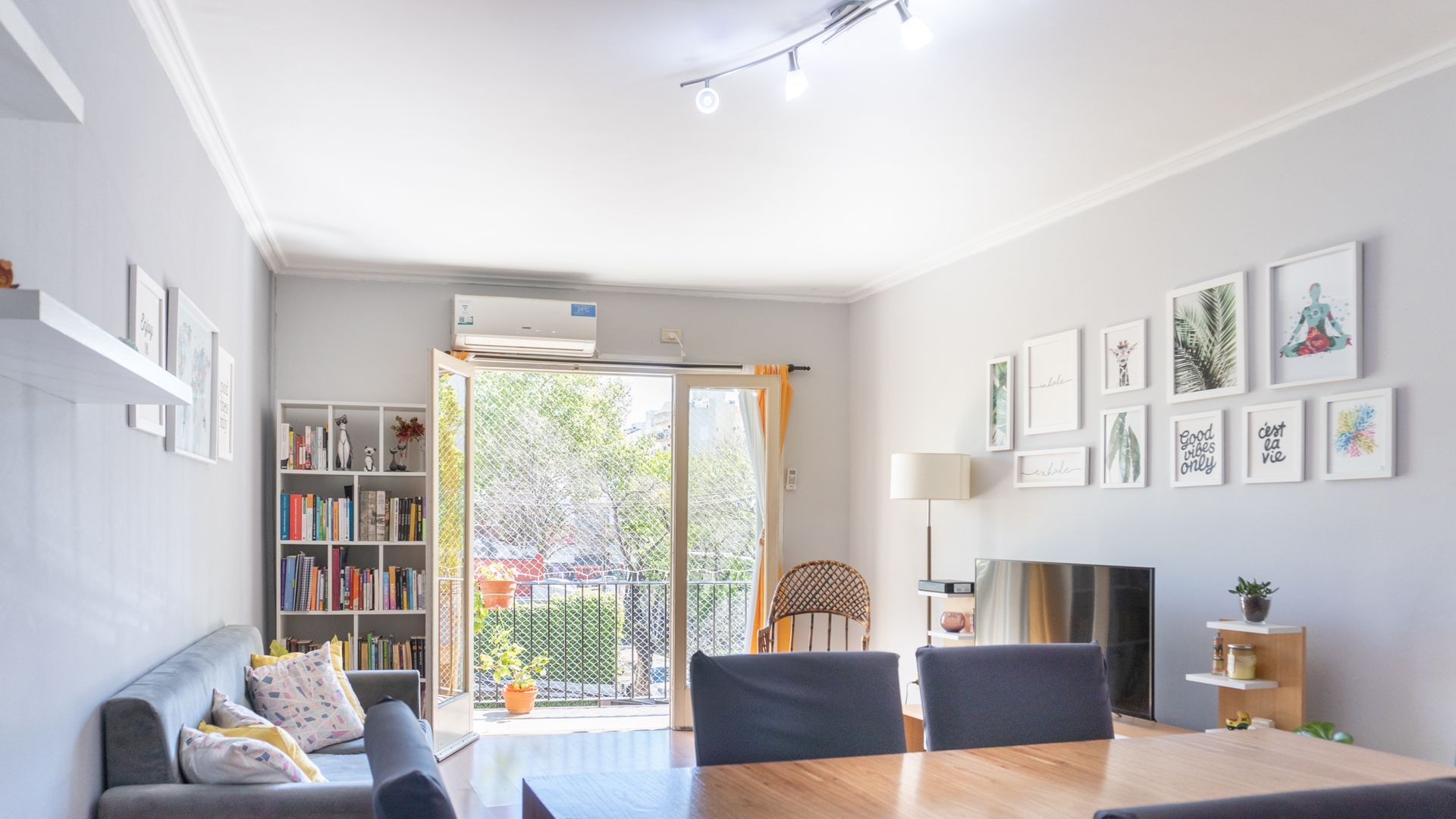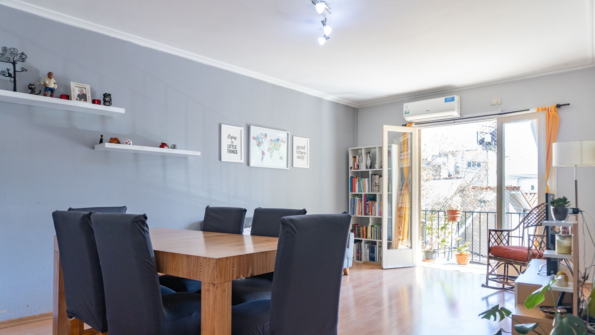 The living room is spacious, equipped with reversible air conditioning, and opens onto a walk‑through balcony that offers an outdoor space to enjoy the view and the climate. The full bathroom includes a bathtub and bidet, and also has natural ventilation.