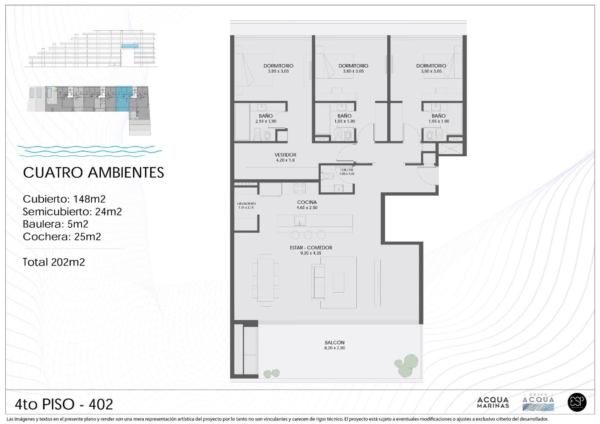 Semisurface apartment of 172 m² (148 m² covered and 24 m² semi‑covered) located on the 4th floor of a 6‑storey building on Avenida del Puerto in the Rincón de Milberg neighbourhood, Buenos Aires. The property, constructed in 2025, is scheduled for handover in December 2027 and features high‑quality finishes and a functional layout of 4 rooms, including 3 en‑suite bedrooms and 1 toilet. The total area, including a 5 m storage loft, reaches 202 m².