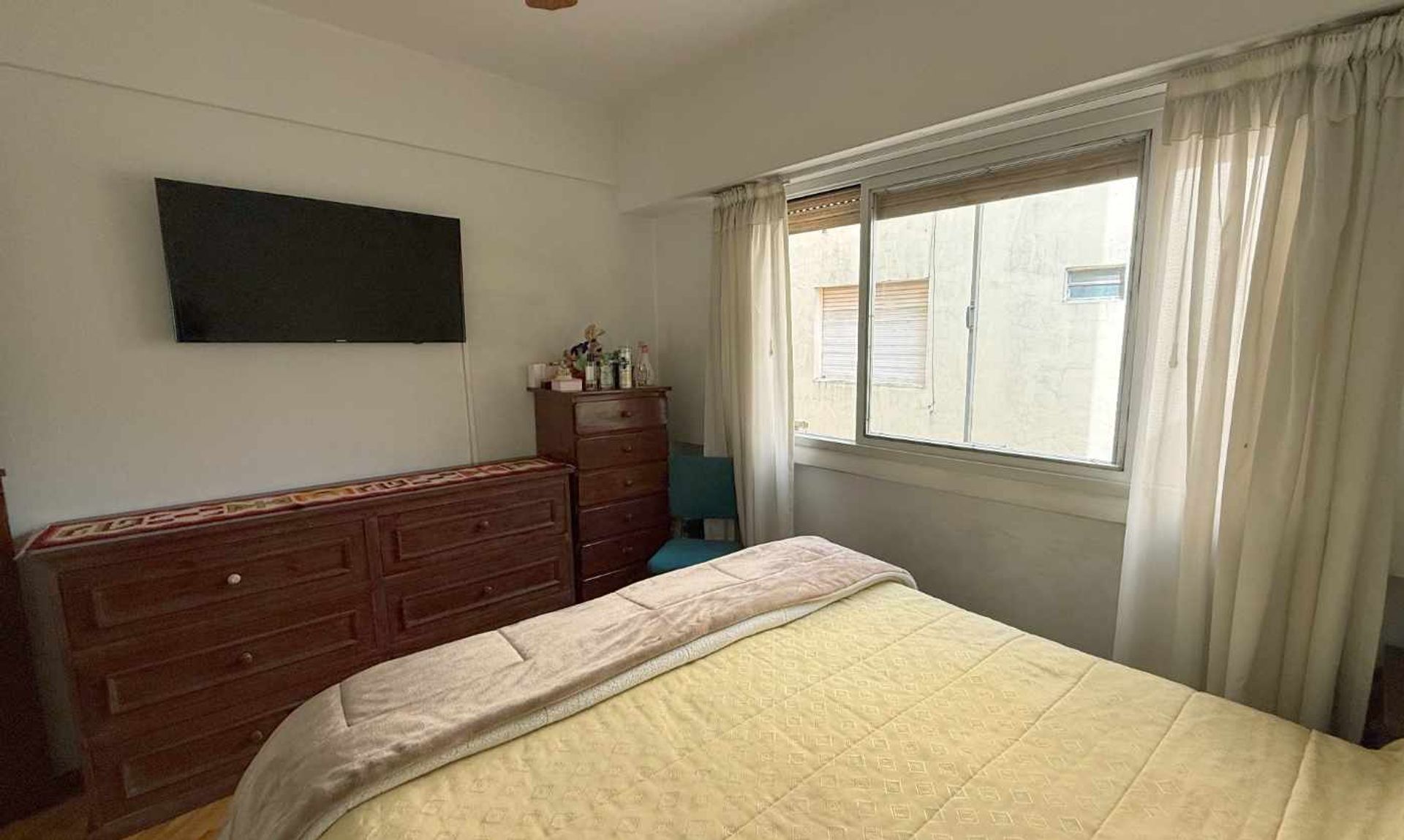 The living room is highlighted by a large window that floods the space with natural light and includes air conditioning with both cooling and heating modes. Additionally, the French balcony provides an outdoor resting corner.