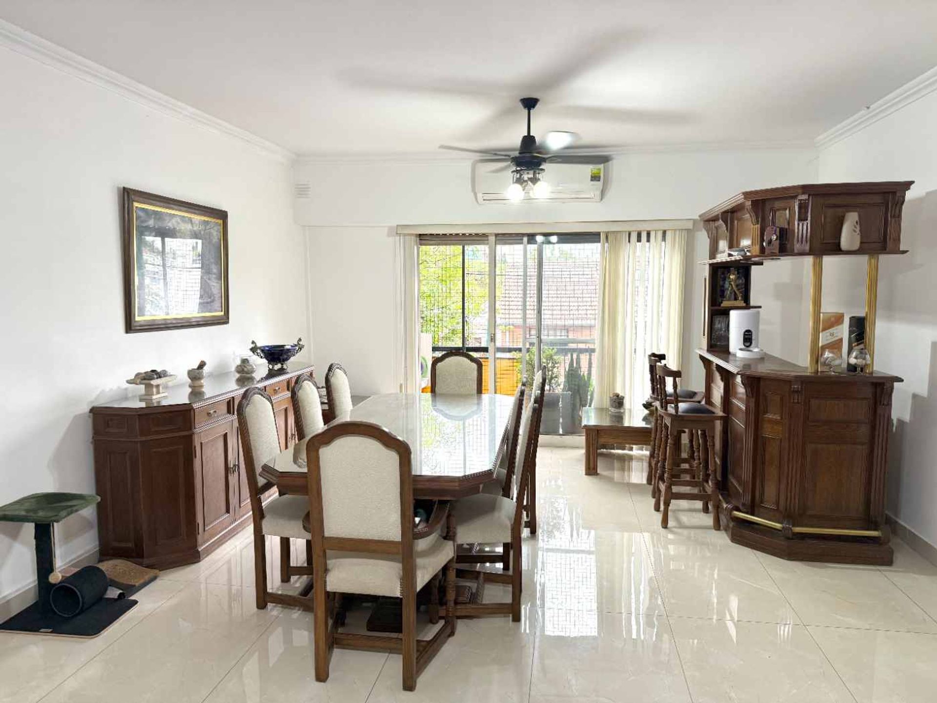 Air conditioning is guaranteed with three dual‑cool‑heat units in the living room and main bedrooms, and a cooling unit in the attached room. The electrical installation has been segmented and upgraded.