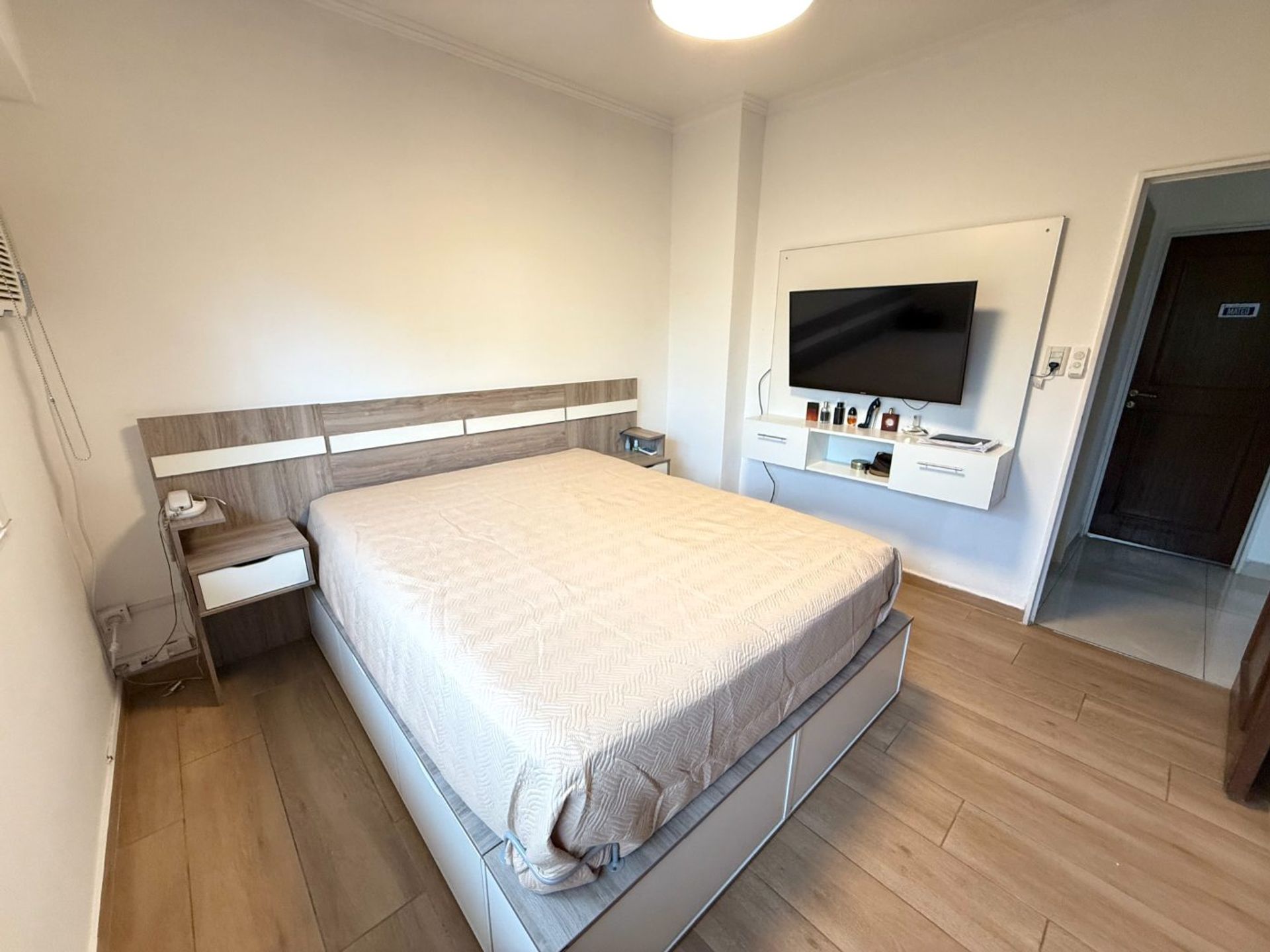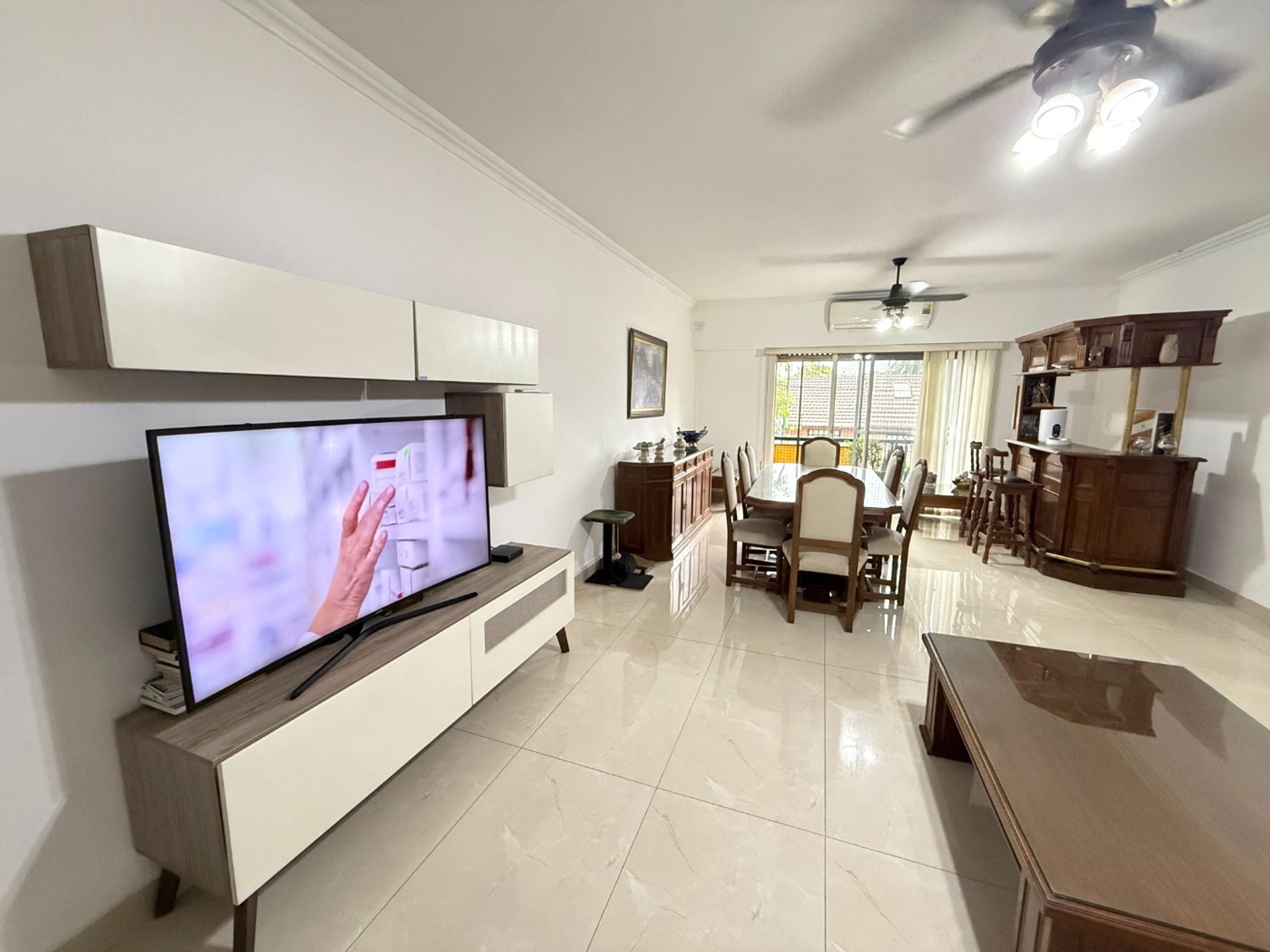 The living room, the two main bedrooms, and the bathroom have been renovated with porcelain tile flooring, while the third bedroom features wood‑effect porcelain tile flooring.