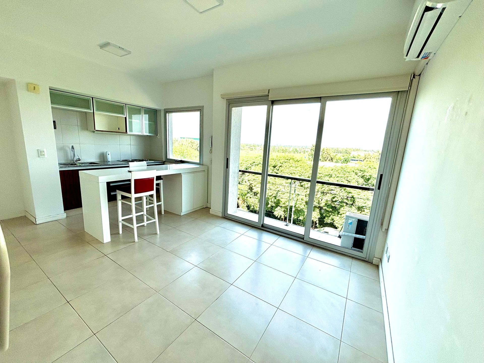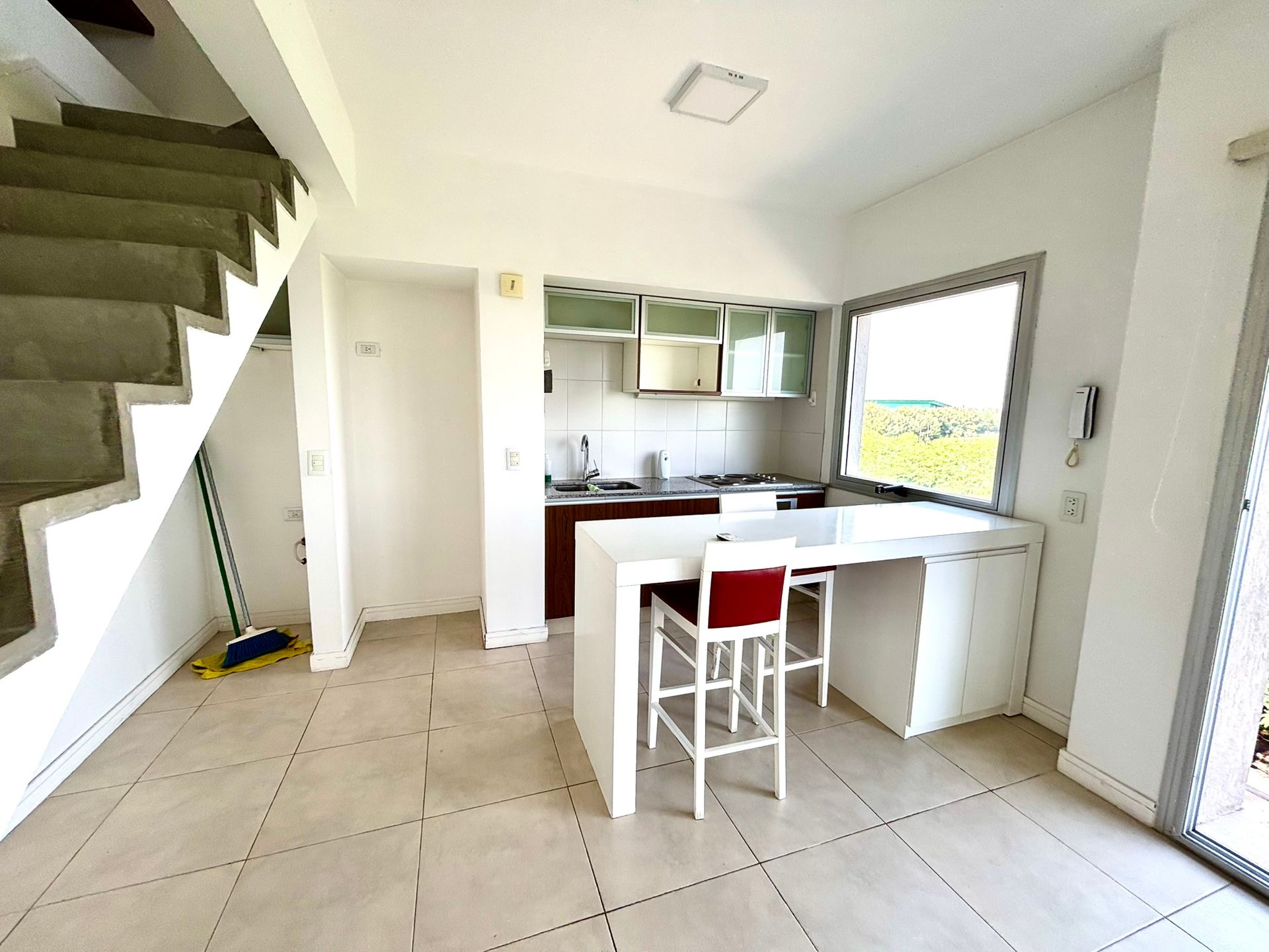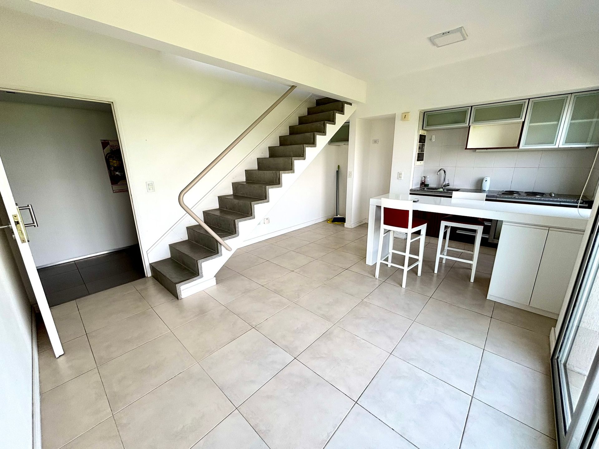 Duplex apartment with 2 rooms located in the exclusive El Palmar neighborhood, Nordelta, in the Posadas Sur area. The entrance opens to a spacious living-dining area with an integrated kitchen and mobile bar, offering a direct frontal view of the building’s front.