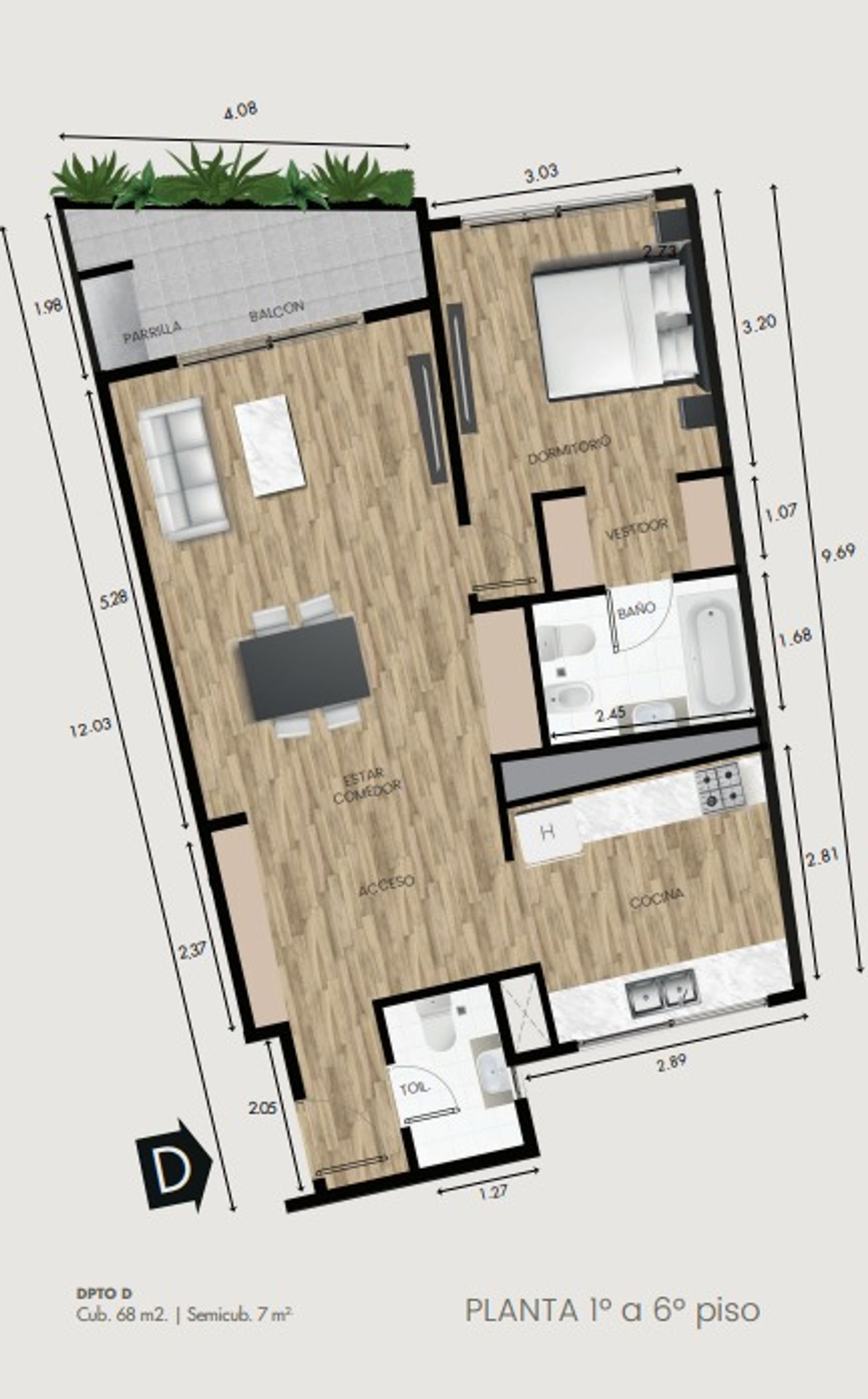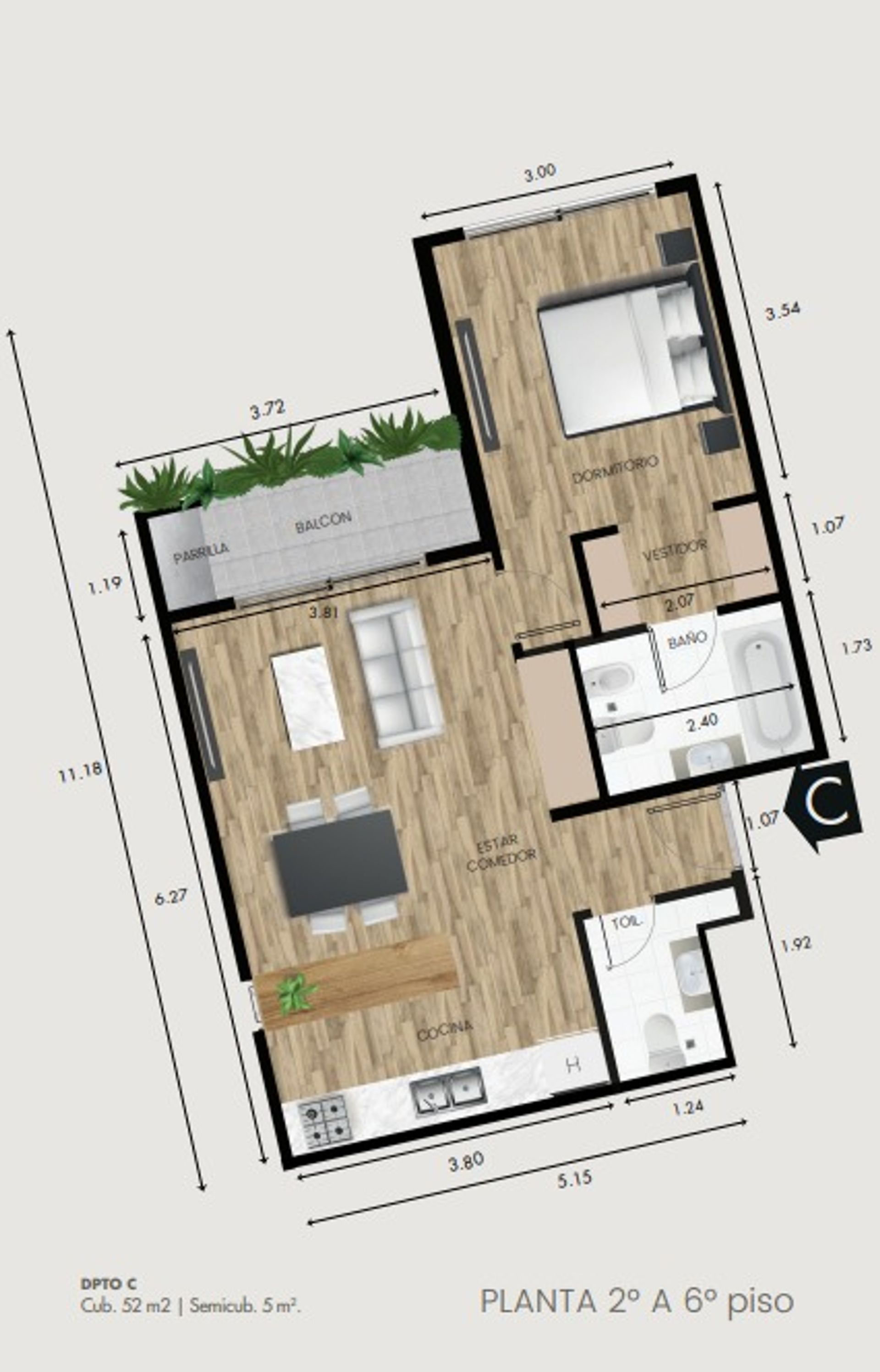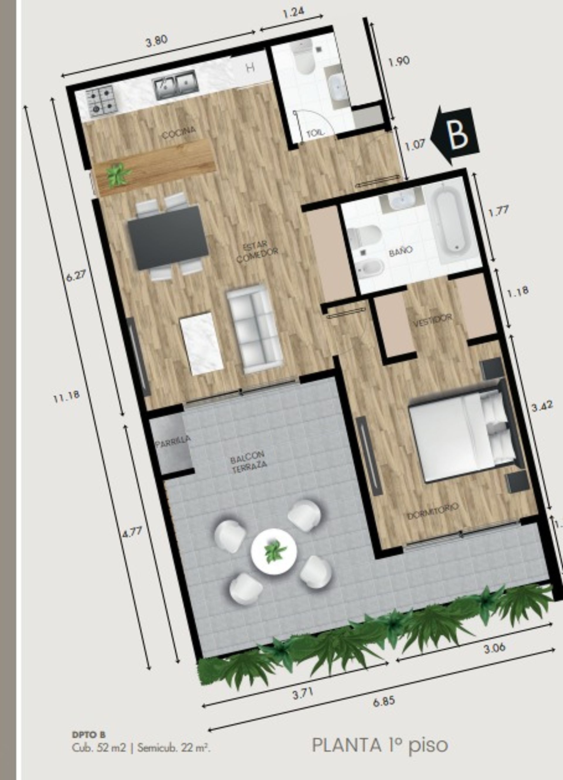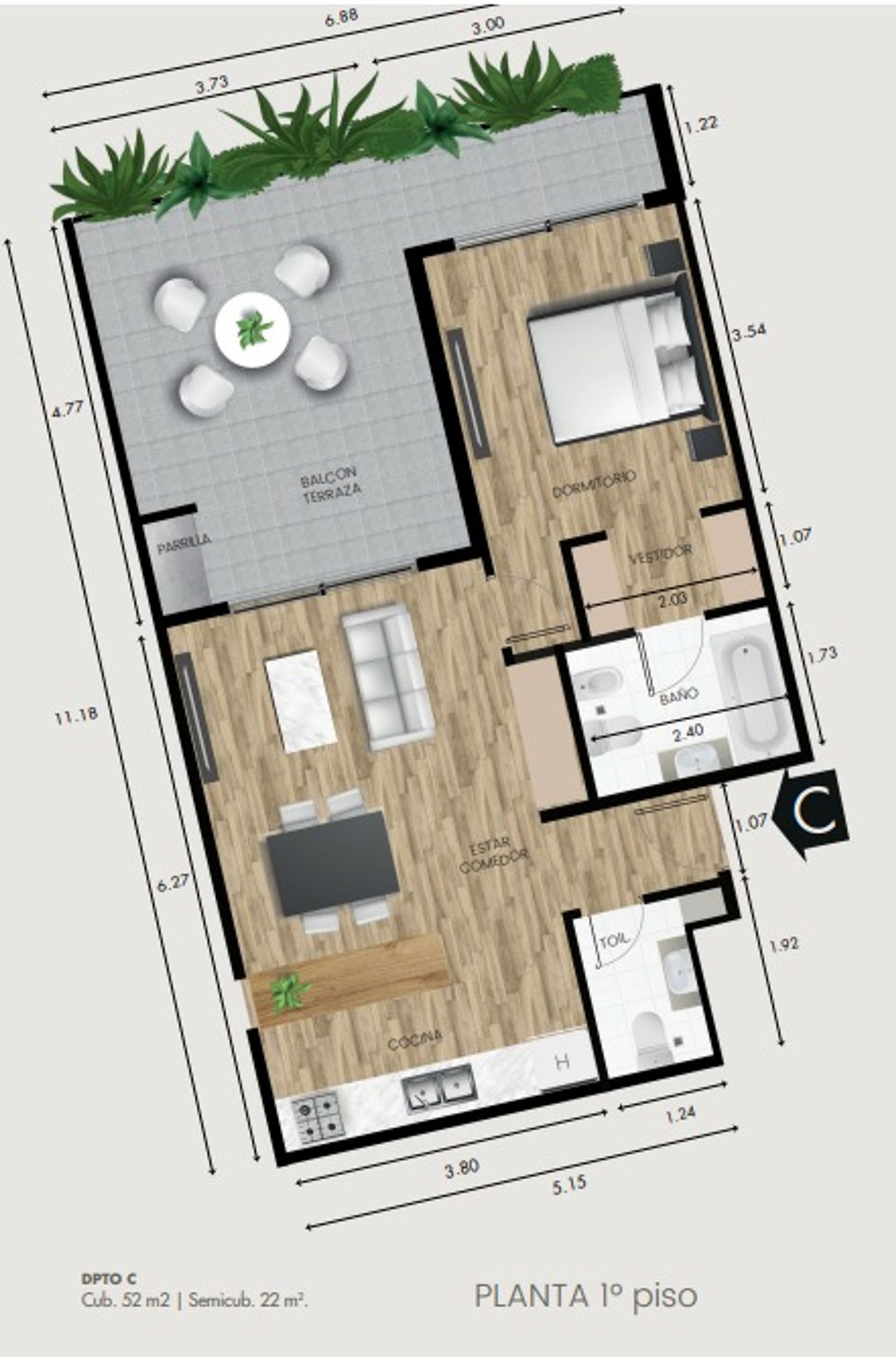 Located in the heart of Tigre Centro at Av. Cazón 1063, a six‑storey residential development rises, offering 24 two‑room apartments, all featuring modern design and high‑quality finishes. Each floor houses four units that combine spaciousness and functionality, with furnished balconies, and on the ground floor, private patios that provide exclusive outdoor space.