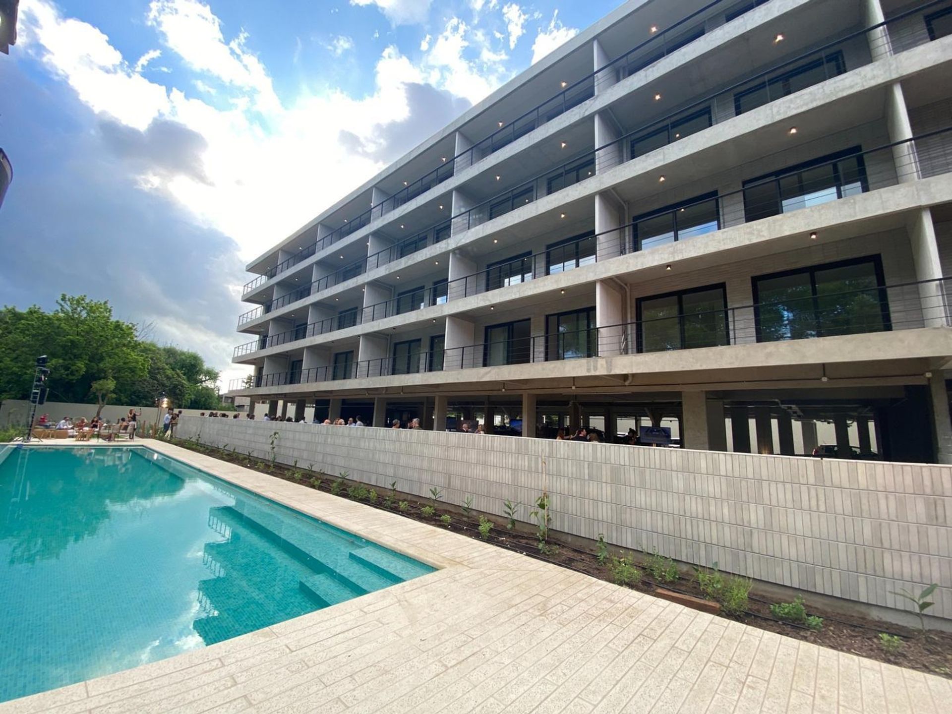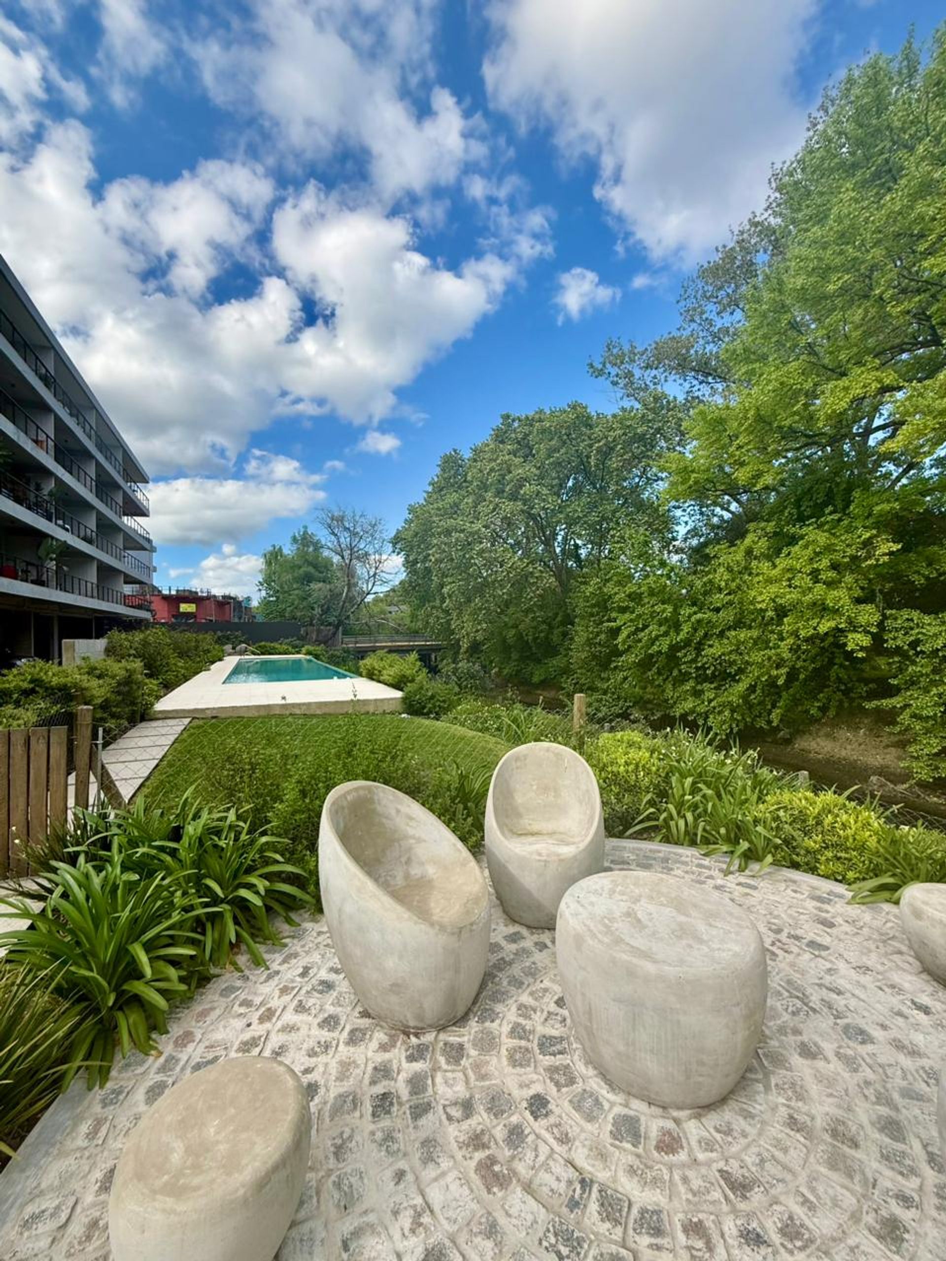 First‑class amenities include an infinity pool with river views, surrounded by 500 m² of landscaped gardens, a terrace with solarium, two fully equipped multipurpose rooms, and outdoor grills for gatherings.