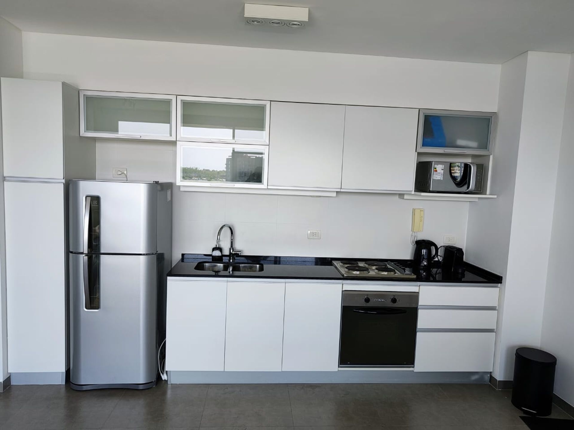 Two-room apartment with bay view, includes covered parking and storage. The kitchen integrated with the living offers a functional and spacious area, while the en-suite bedroom provides privacy and comfort. A reception toilet completes the layout, and a continuous balcony with grill invites outdoor enjoyment.