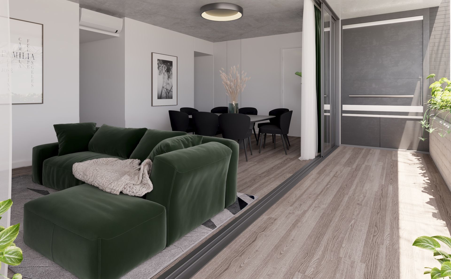 The apartments feature a spacious living‑dining area that opens onto a balcony terrace overlooking the front, ideal for enjoying natural light and cross‑ventilation. The separate kitchen is equipped with cabinets and under‑counter storage, providing functionality and style.