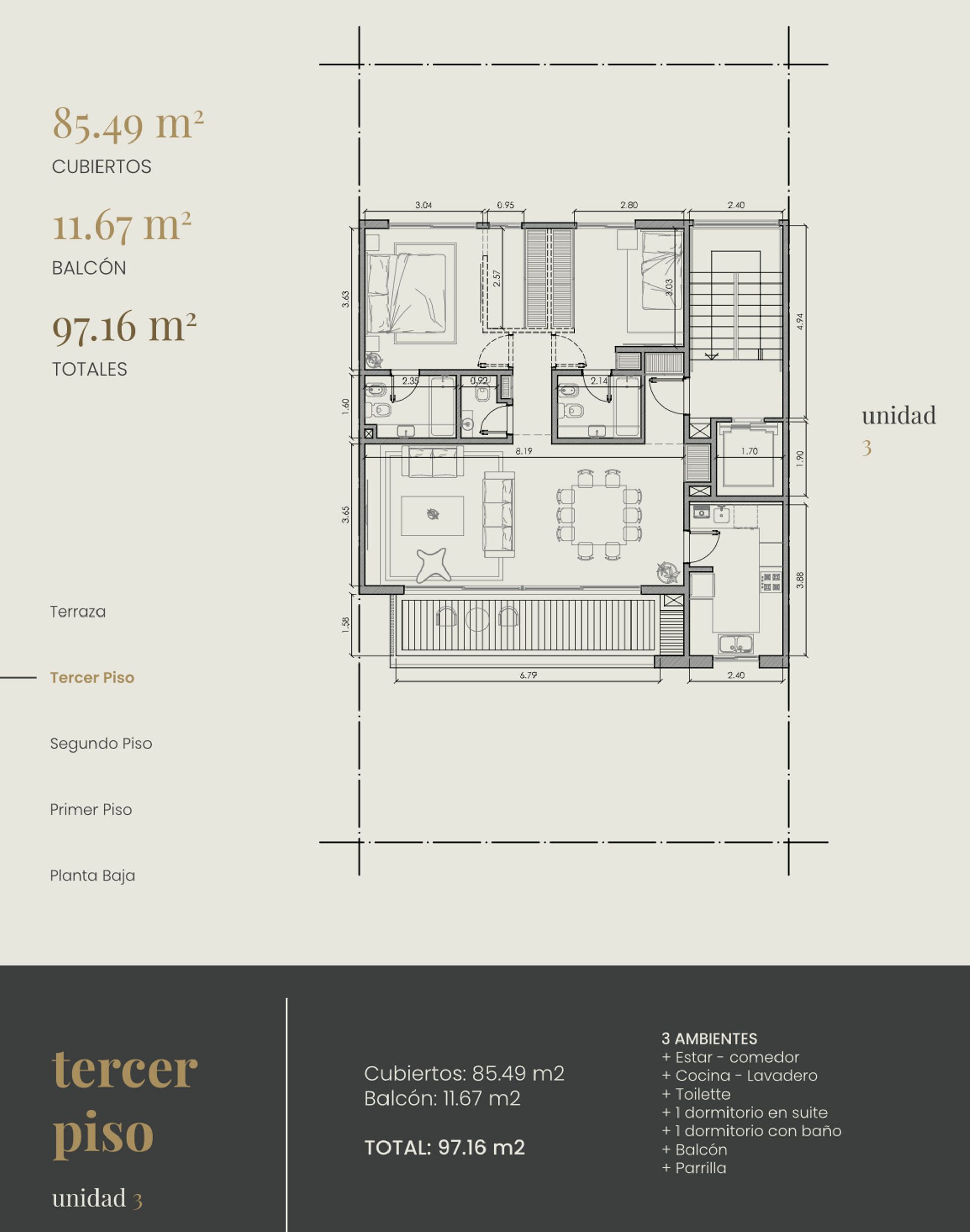 Each unit includes two en‑suite bedrooms and a toilet. The balcony terrace includes a grill, allowing outdoor social moments. Additionally, two carports per apartment are included, ensuring convenience and security.