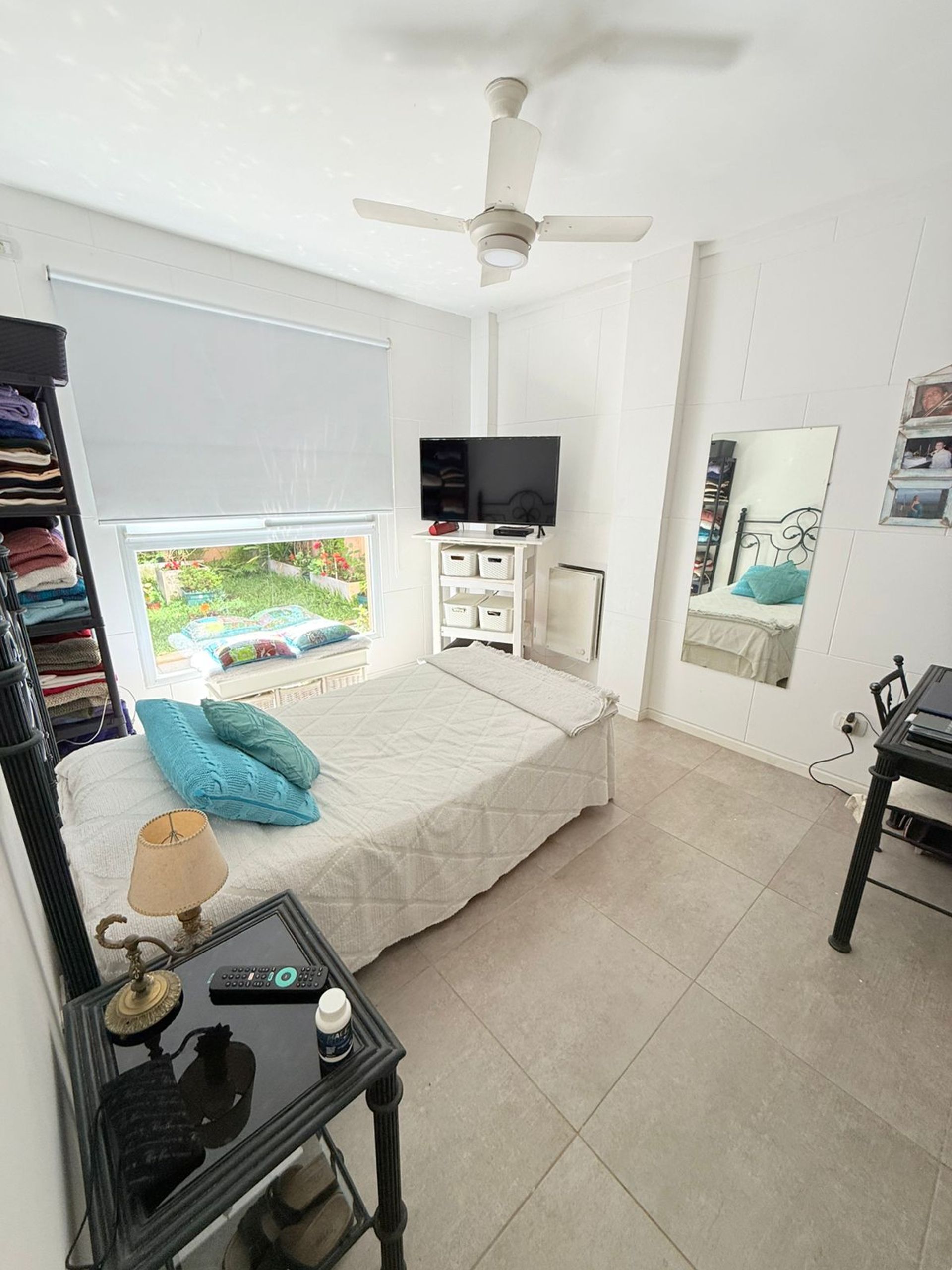 The living room, bright and spacious, opens via a sliding window directly onto the garden, creating an ideal space for entertaining guests or enjoying moments of tranquility. The ceiling is fitted with a fan, while the interior layout accommodates both a living area and a functional dining space.