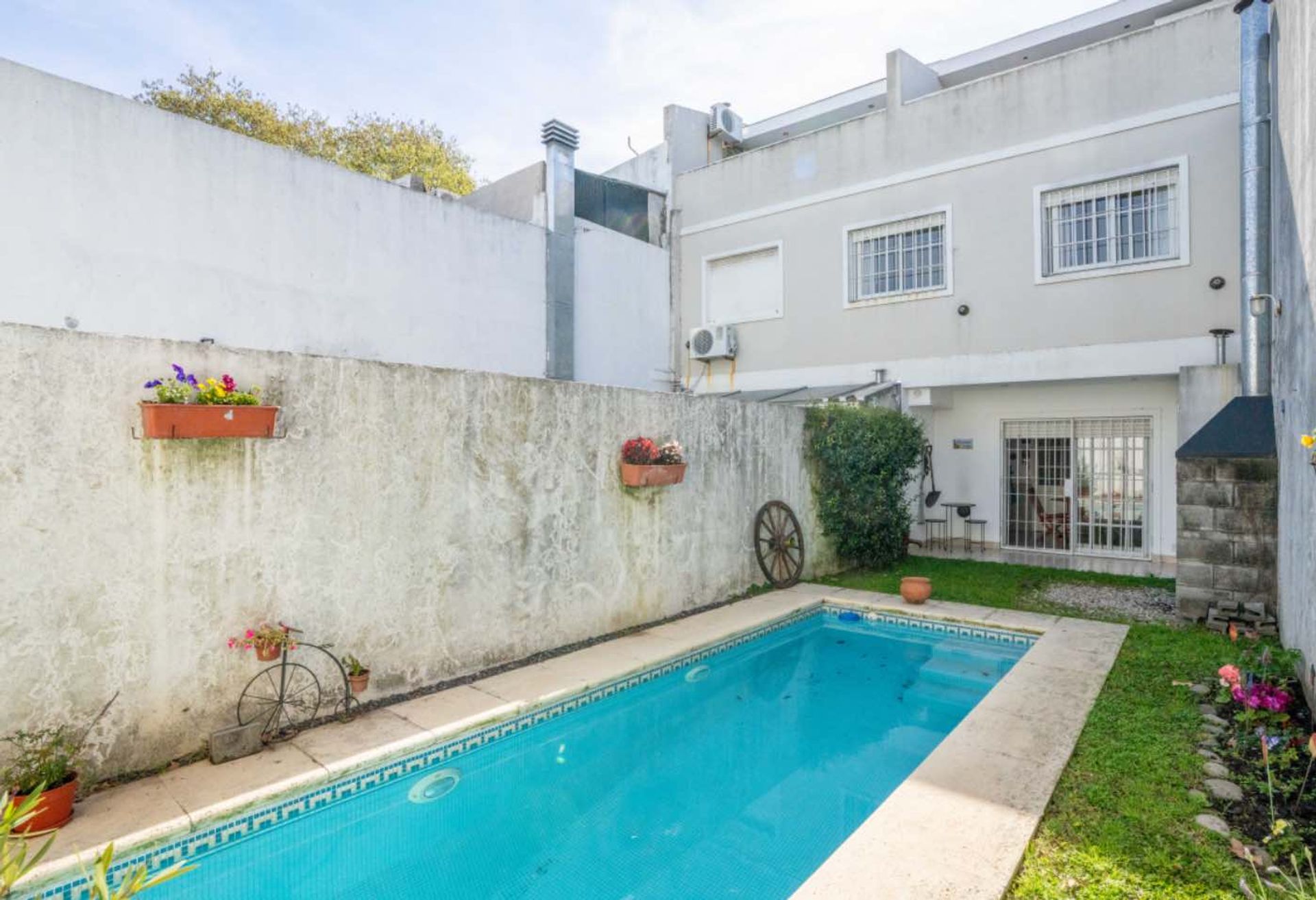 The entrance opens to a semi-enclosed garage, accessible via an automated gate. A spacious living/dining area, with floating hardwood flooring, a wood-burning fireplace and a dual-zone HVAC system, invites gathering in a warm and bright environment. The guest toilet complements the entrance with a touch of distinction. The detached kitchen, with ceramic tile flooring and generous under-counter and over-counter storage, is equipped with an oven and gas range. A large window opens the kitchen to the garden, enhancing natural light. The semi-enclosed gallery, with an integrated laundry area, connects the service zone with the outdoors. The garden, featuring a grill and a pool finished with Venetian tiles, offers a private oasis to enjoy sunny weather.