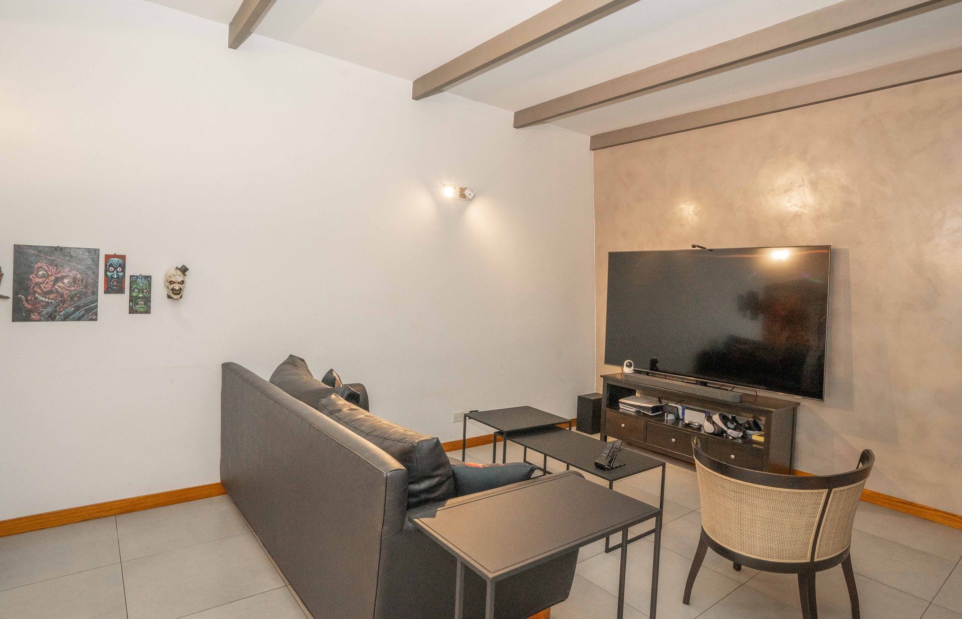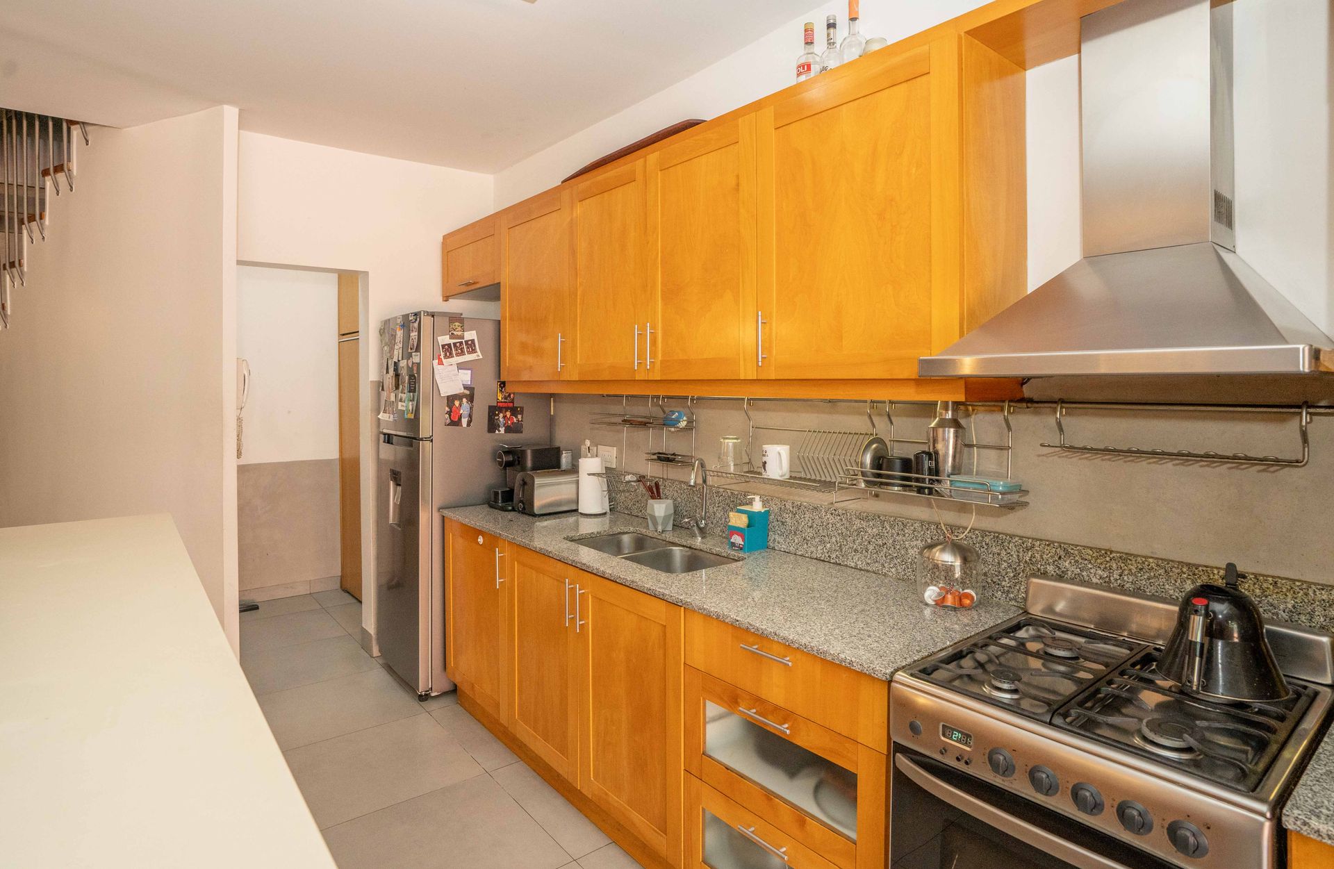 PB: Upon entry, a reception hall opens with a spacious receiving closet and toilet. The large living/dining area features porcelain tile flooring and an air‑conditioning system. The integrated kitchen includes a gas stove and oven, as well as ample lower and upper cabinets under and above the counter. A large pantry provides additional storage space. Outside, there is a patio with a semi‑covered gallery, grill, and laundry area, ideal for enjoying the autumn weather.
