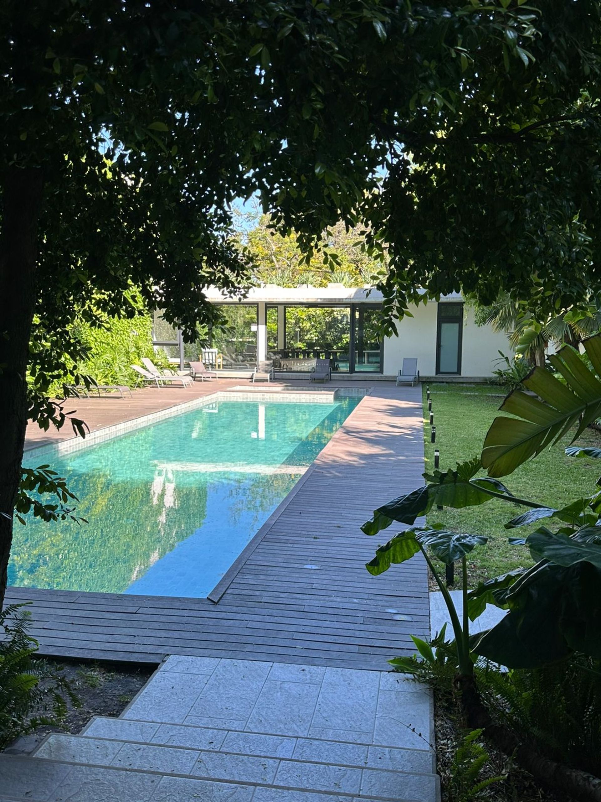 The building offers a multi‑purpose lounge with a table for 12 people, living area, air conditioning, refrigerator, and toilet, as well as a grill and barbecue. The heated pool measures 3 × 16 m and an expansive landscaped garden complement the amenities. 24‑hour security, automatic gate, and fixed covered parking are provided.