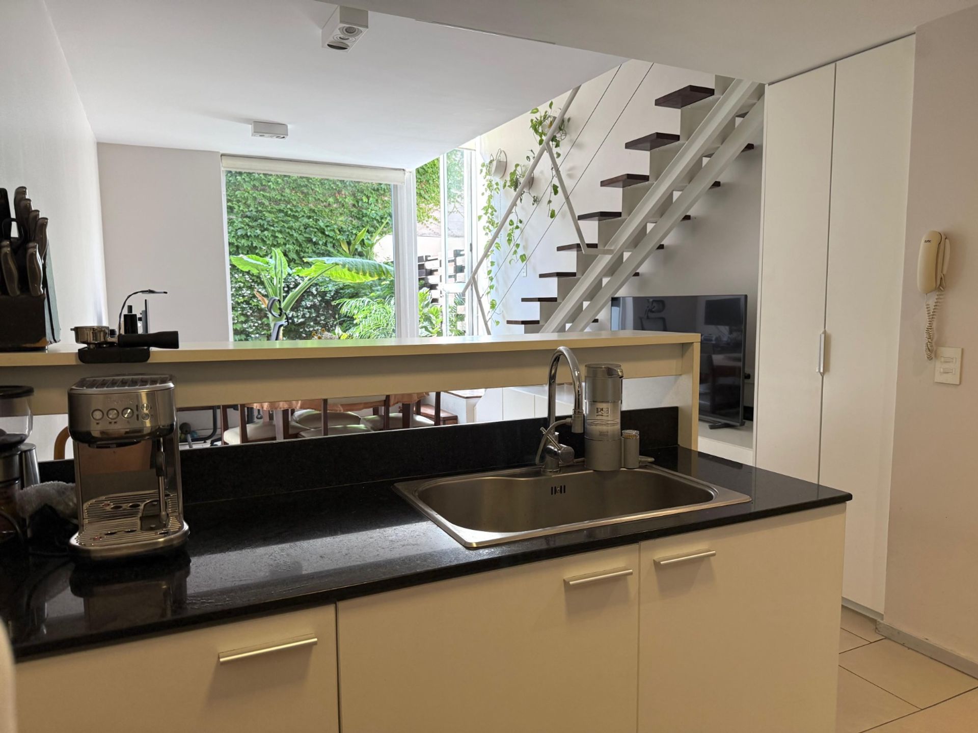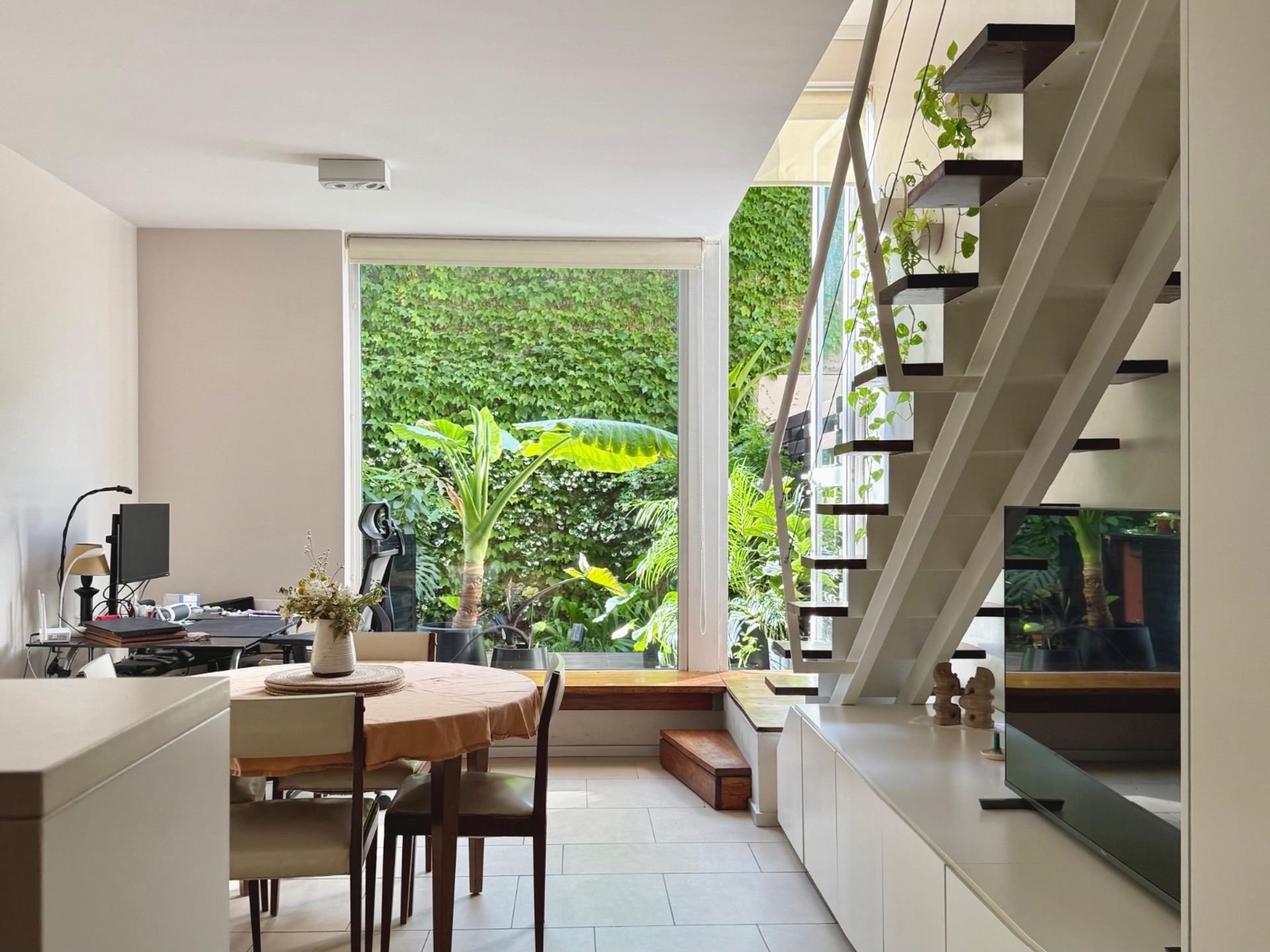 On the ground floor there is a spacious living room with a large floor‑to‑ceiling window that allows natural light to enter and provides direct access to the private patio. The private garden features a grill, ideal for outdoor gatherings. The entrance includes a reception toilet and the kitchen is equipped with a four‑burner ceramic hob, electric oven, and a bar integrated into the living area. A functional laundry complements the service area. The white lacquered MDF furniture beneath the staircase adds an elegant touch.