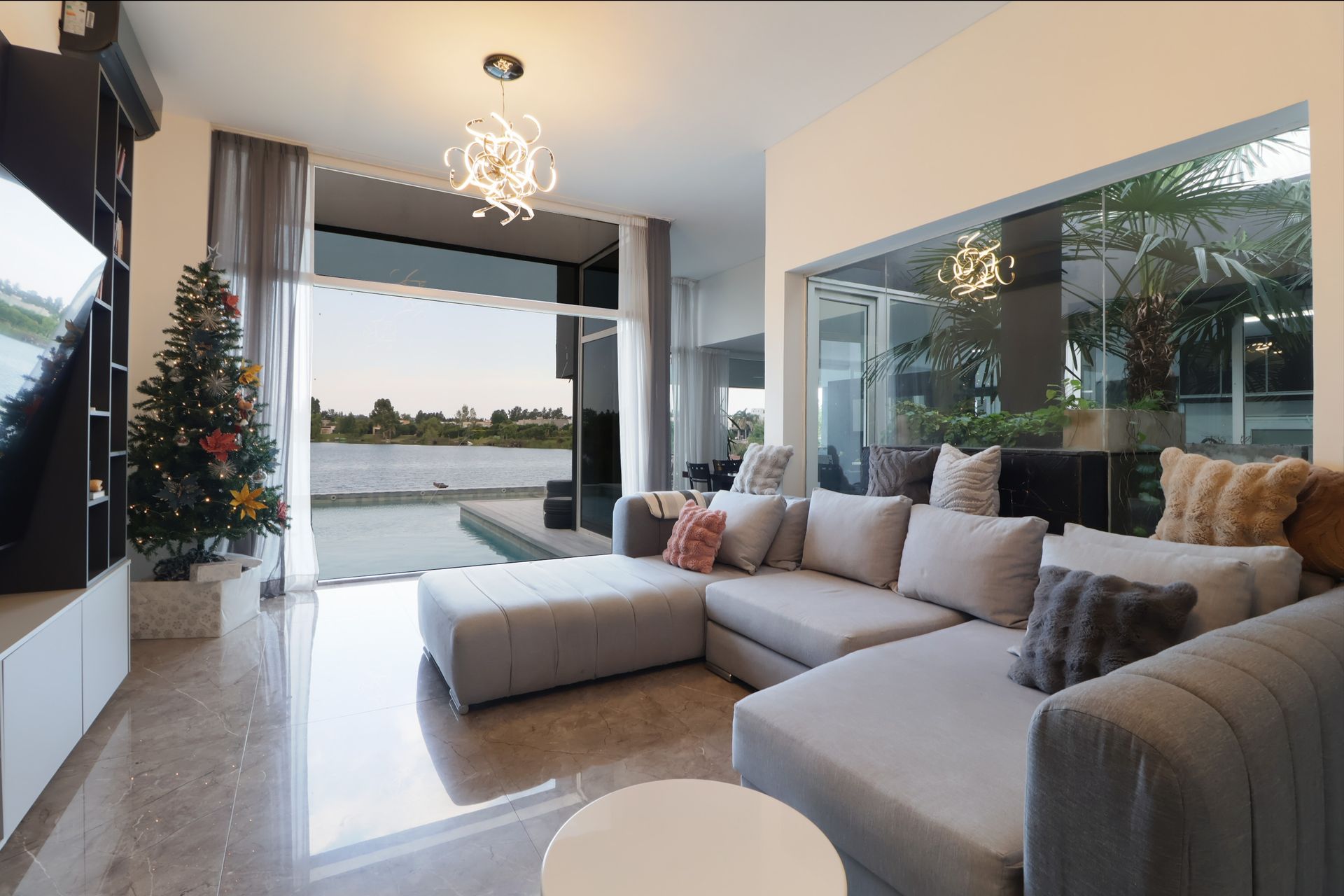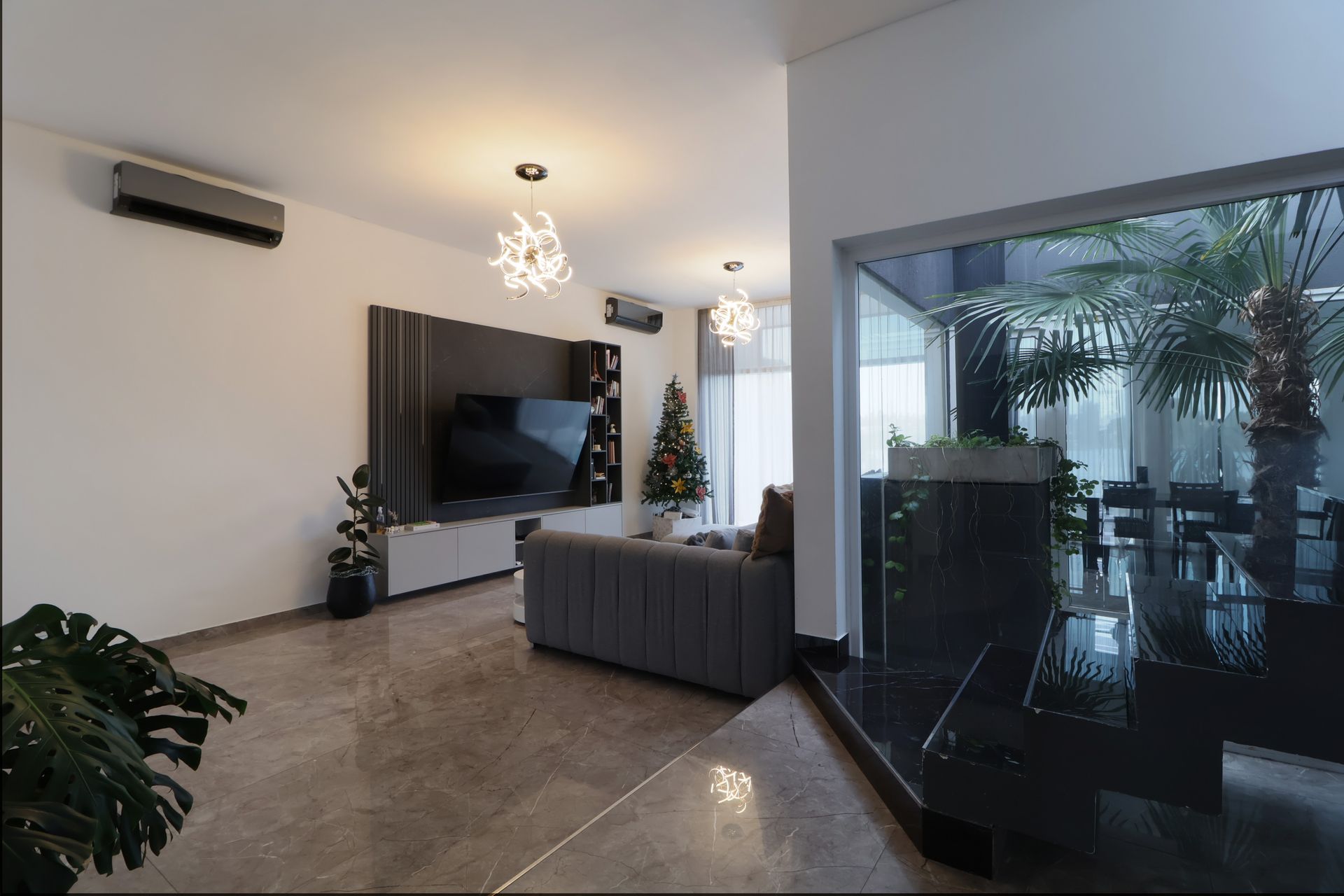 The upper level houses a bright foyer that leads to three bedrooms. The master bedroom, en‑suite with walk‑in closet, is distinguished by its abundant natural light and windows overlooking the garden with lagoon views. The other two bedrooms share an en‑suite bathroom, ensuring comfort and privacy. Large windows throughout the house provide ample natural light and ventilation. A winter garden, located at the center, surrounds the ground‑floor spaces, creating an intimate and sheltered area.