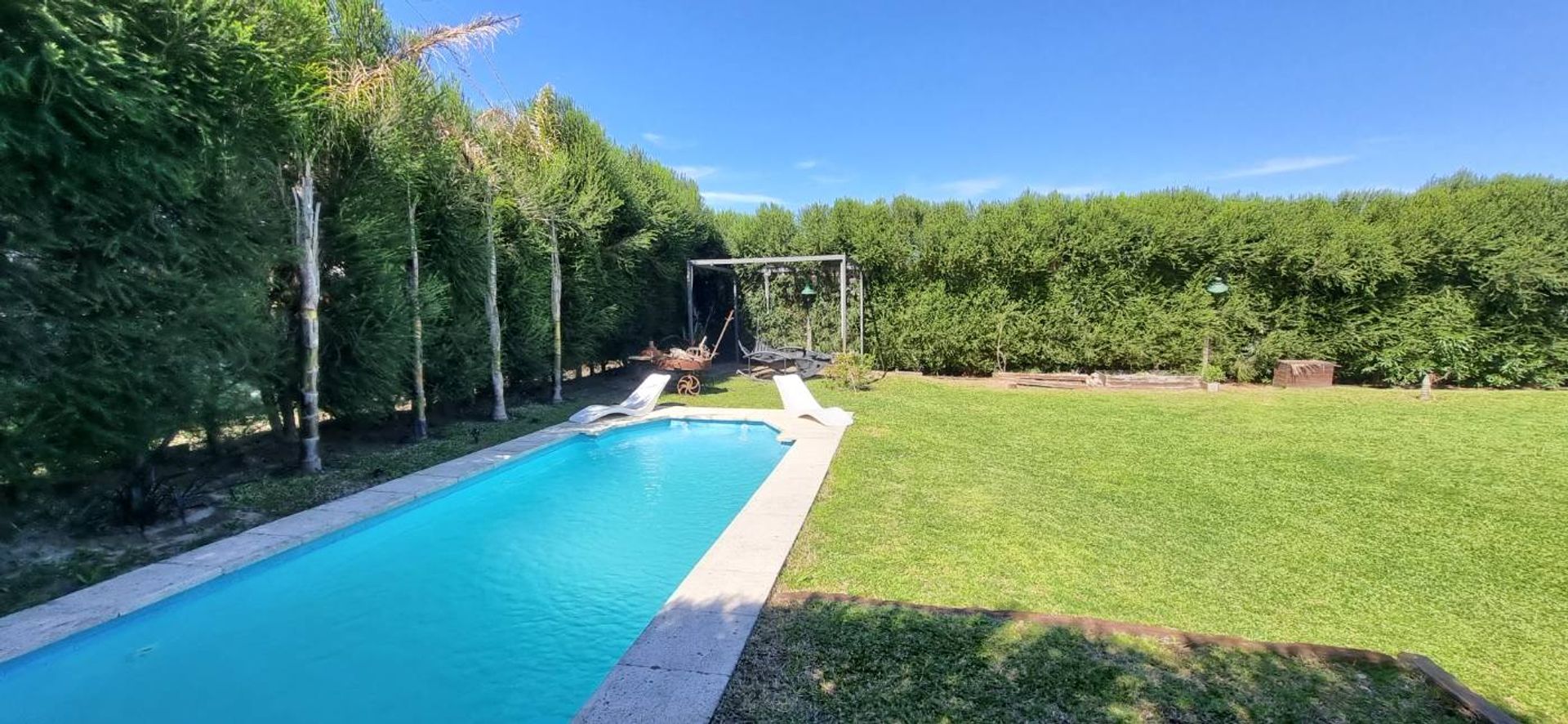 Inside, it features three bedrooms, including a primary suite, two full bathrooms, a reception hall, and a spacious living room with dining area. The kitchen, with space for a daily dining area, connects to a covered gallery with vertical awnings, ideal for year‑round use. An internal patio completes the outdoor living area.