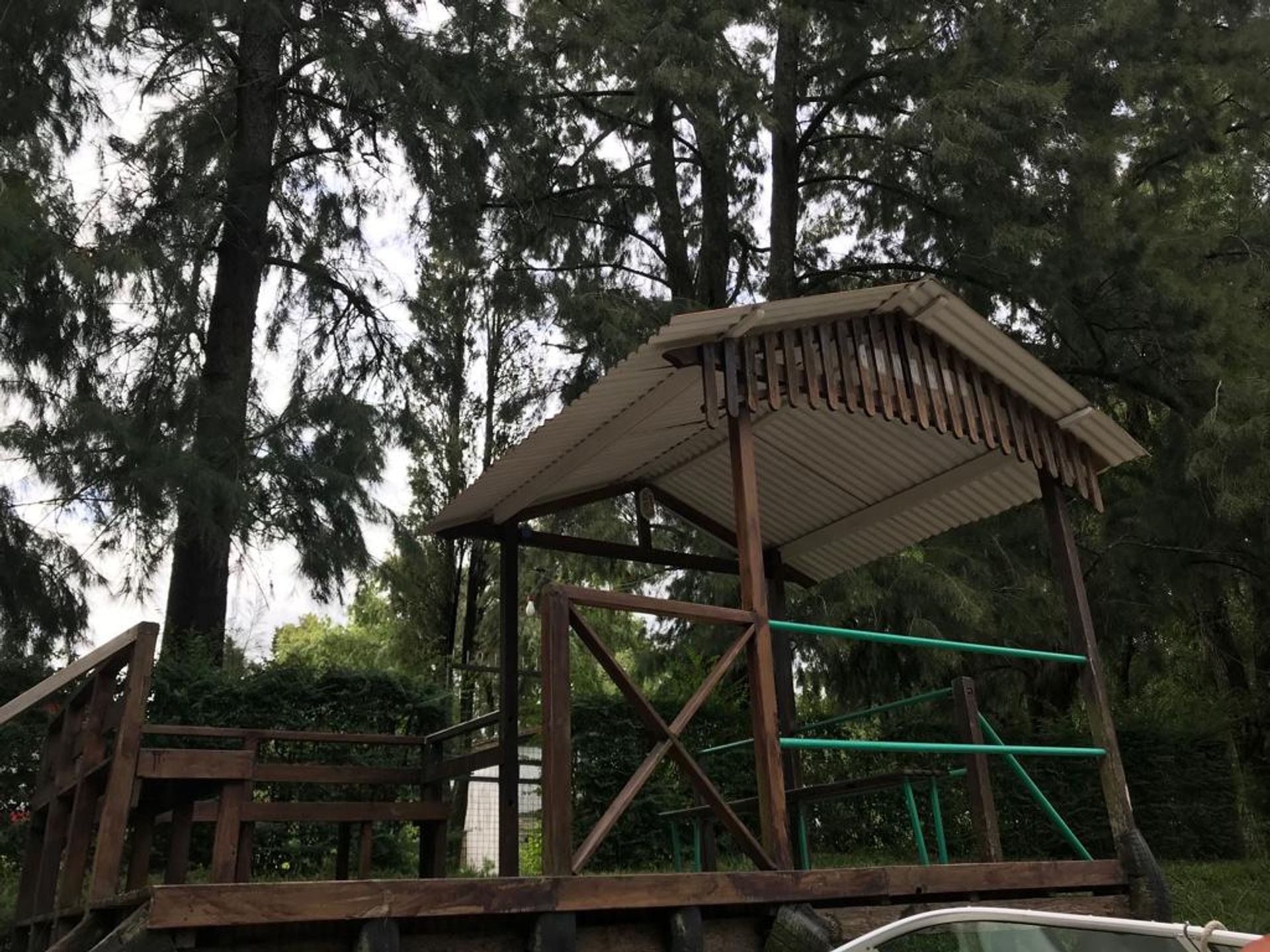 The residence, built on an elevated structure, offers two bedrooms of 3×3 metres each, a full bathroom, and a living area with an integrated kitchen and dining room of 8×5 metres. A gallery opening onto the garden provides a bright and versatile space.