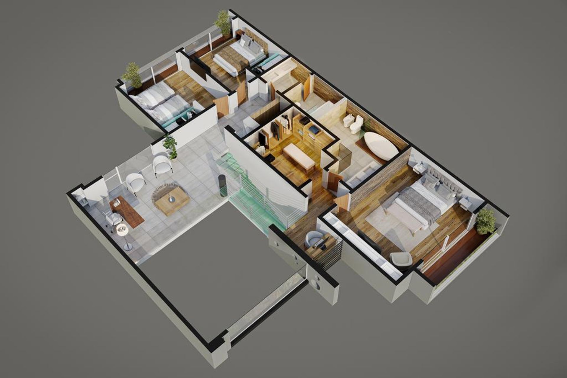 The upper floor contains a private gym, a sauna, and another bedroom with a full en‑suite bathroom.
