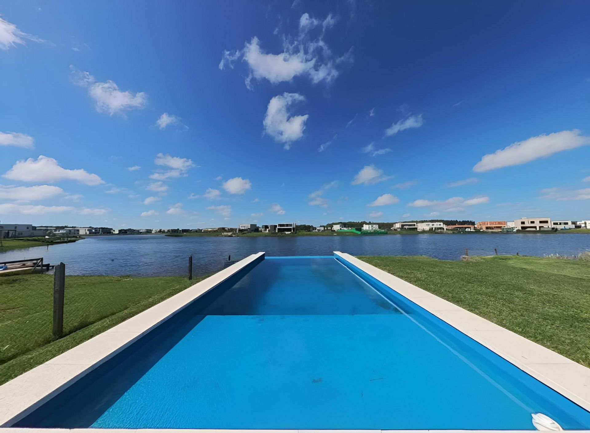 The rear patio showcases a column‑free gallery, equipped with a grill, splash‑box, and oven, adjacent to an infinity pool. It also includes a garage, a dock, and a lagoon access ramp.