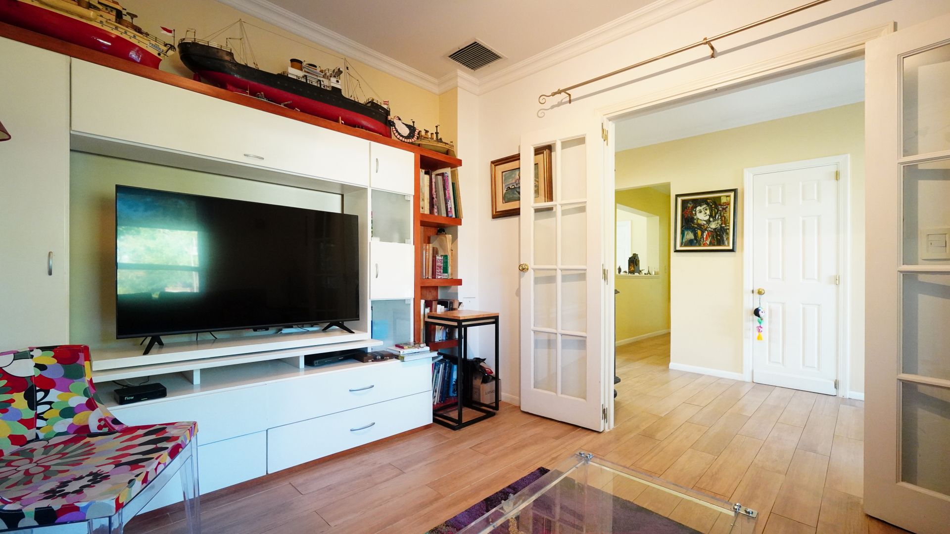 On the ground floor, a foyer leads to a versatile space: family room or office, ideal for a home office, play area, or TV room. The living‑dining area features a cozy fireplace and direct views of the gallery, garden, and lake. A guest toilet is provided, along with a bright kitchen with a casual dining area and access to the gallery, a laundry room, a service bedroom with en‑suite, and a practical pantry for food storage.