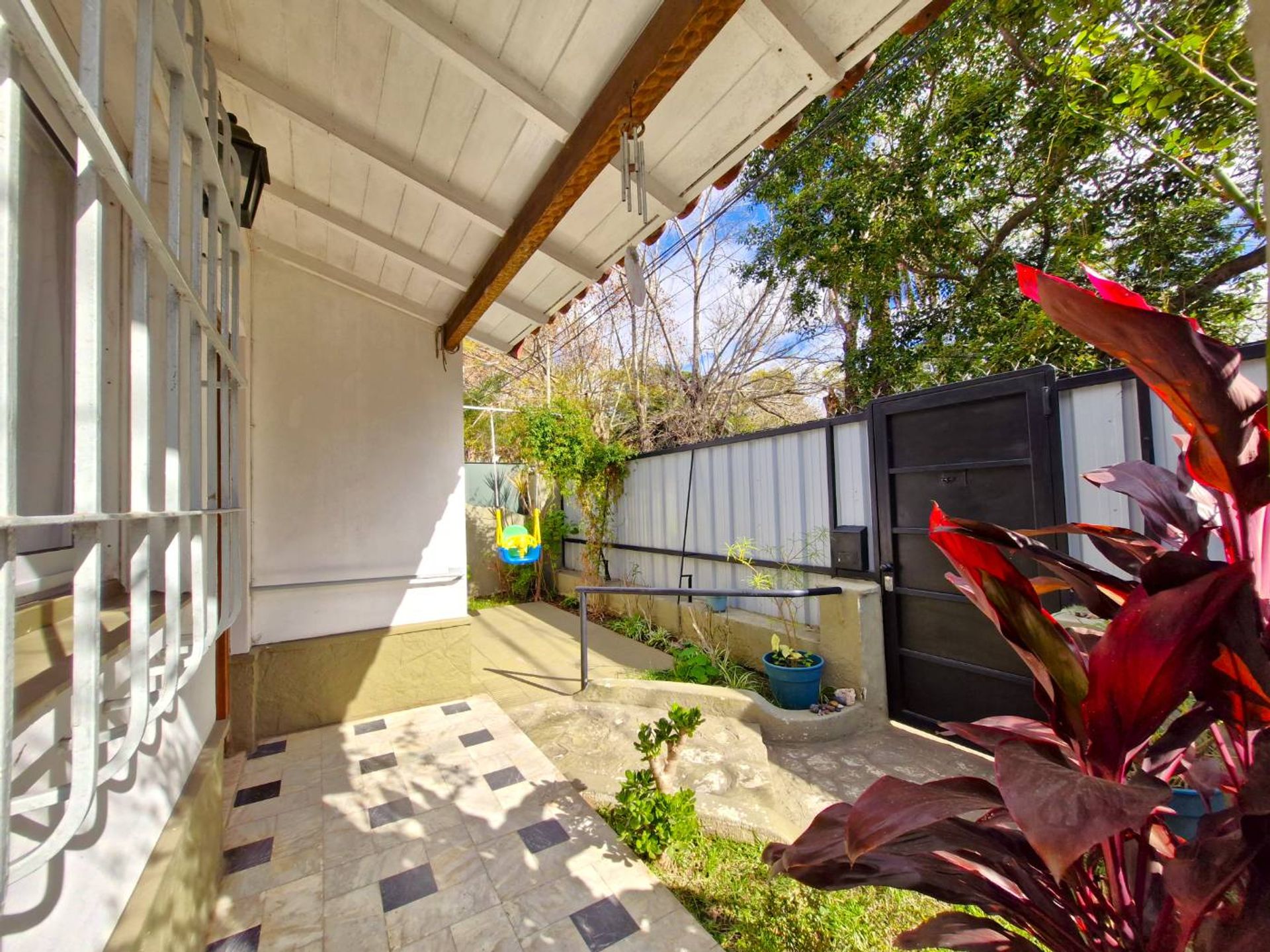 The spacious front patio, oriented northeast and northwest, is fully sun‑exposed and surrounded by fencing that provides great privacy. Its L‑shape facilitates the creation of green areas and rest zones. At the same level is a semi‑covered entry porch, a living room with a gas fireplace and large windows that offer abundant natural light throughout the day. The kitchen‑dining area, updated in style, has windows overlooking the private zone, a newly installed sanitary and gas system, new appliances, a gas water heater, full cabinetry under the countertop, pantry and breakfast bar, and a balanced‑draft gas heater. A full bathroom, with bathtub, modern sink, mirror and storage cabinet, completes the space. Two generously sized bedrooms (approx. 3.5 × 4 m each) with built‑in wardrobes and windows that provide lighting and ventilation, and natural wood flooring, offer comfort and style. A hallway adjacent to the kitchen houses the laundry area with a washing basin and connection for a washing machine, a staircase to the upper floor, and an exit to the second patio. The house has a covered garage for two cars, with additional space for a motorcycle or bicycle, accessible from Aguado Street via a metal gate.