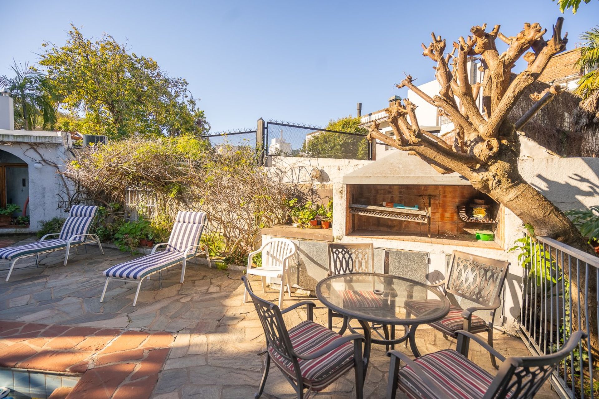 Outdoors, a landscaped garden with established species surrounds the house, providing privacy, harmony, and an ideal setting for family life. The pool with solarium takes center stage on summer days, accompanied by a closed pavilion and an outdoor grill that offer various options for social gatherings and moments of enjoyment. The property includes a garage with space for several cars.